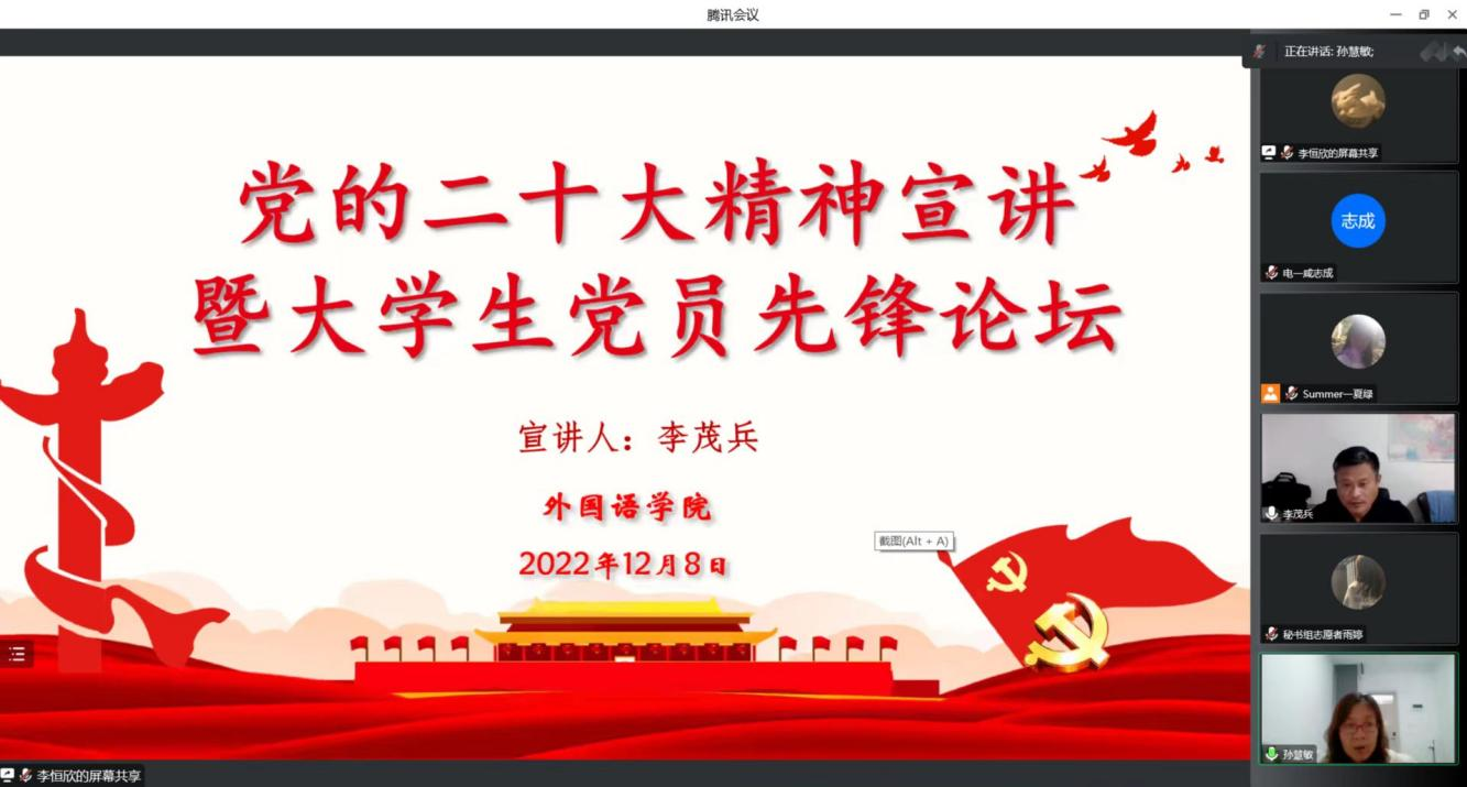 12月8日,外语学院通过腾讯会议举办党的二十大精神宣讲暨大学生党员先锋论坛,学院党委书记李茂兵为青年学子宣讲党的二十大精神,全体辅导员及学生党员、学生干部参加活动。