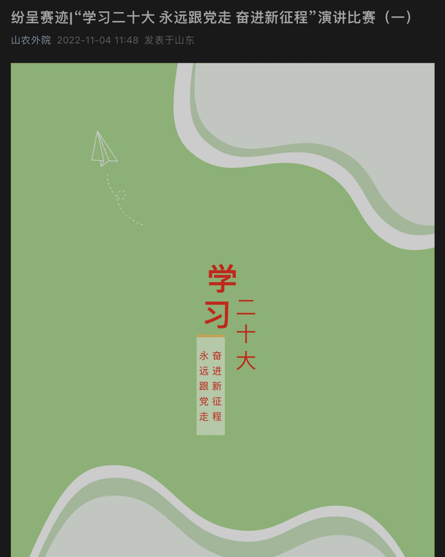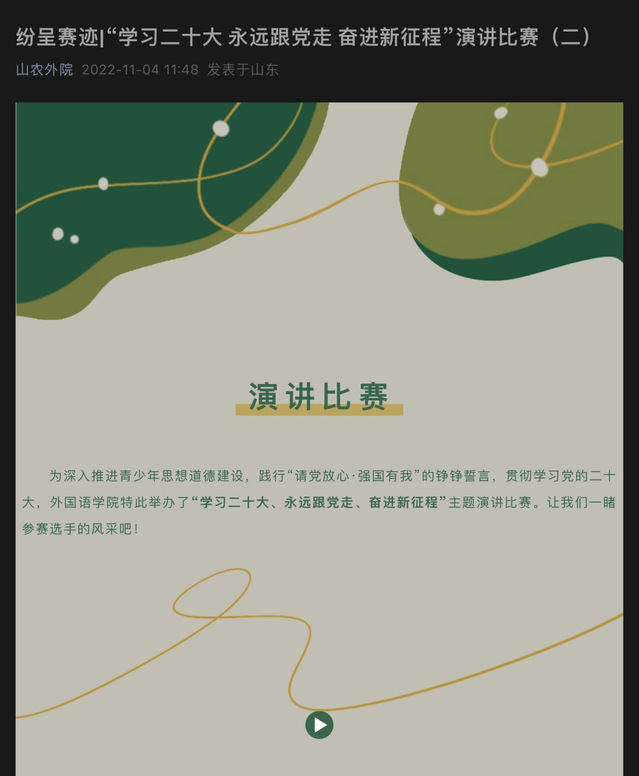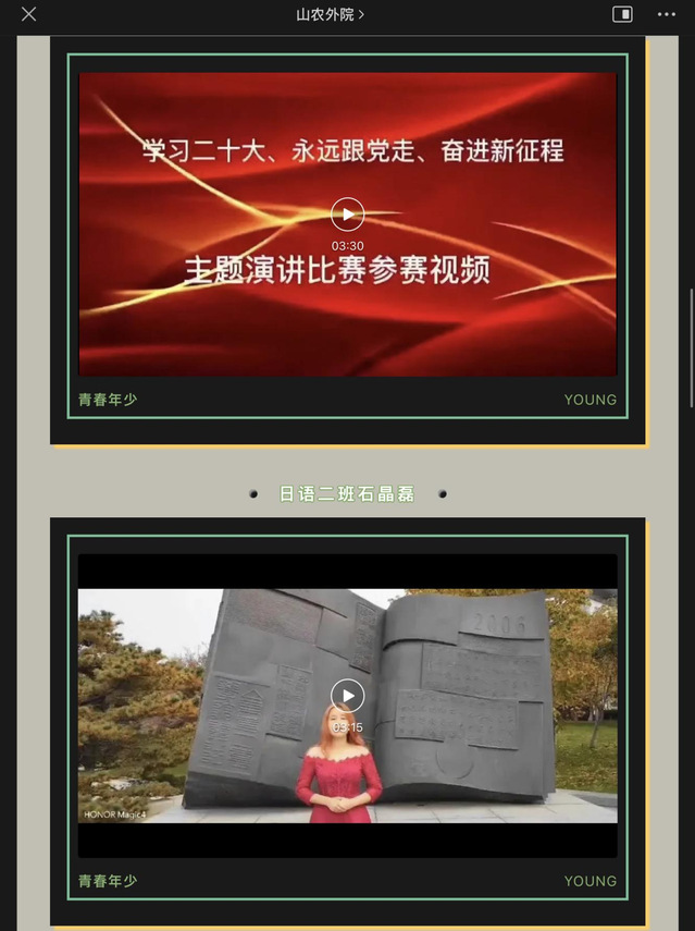 本次比赛以“学习二十大、永远跟党走、奋进新征程”为主题,要求参赛学生结合实际,选择依法治国、绿色发展、文化自信、爱国爱校等方向进行命题演讲。经过选手报名、作品提交、审核初选、线上投票以及评委打分等环节,共有20个参赛视频通过“山农外院”官微推送参与线上投票。这20位选手演讲内容丰富、形式多样,其感情真挚、语言质朴,充分地展现出山农外院学子的风采。其中,来自英语1班的张英超在演讲中以黄浦区卢湾中心小学党支部书记、校长吴蓉瑾为例,指出我们要以社会主义核心价值观为引领,继续坚定文化自信,涵养家国情怀,传承红色基因,不断发扬源远流长、博大精深的中华文化,推进文化自信自强,讲好中国故事、传播好中国声音,推动中华文化更好走向世界。来自英语2班的庄嘉仪讲到,“广大青年应坚定不移听党话、跟党走。怀抱梦想,又脚踏实地;敢做敢为,又善作善成。立志做有理想、敢担当、能吃苦、肯奋斗的新时代中国青年,让青春在全面建设社会主义现代化国家的火热实践中绽放绚丽之花。”
