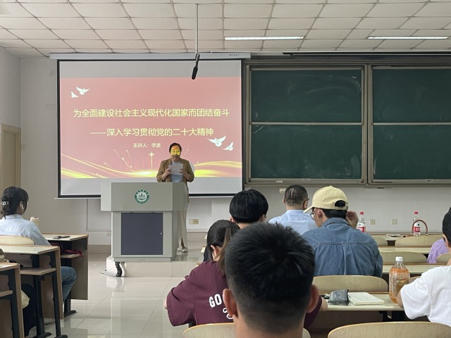报告会上,李波以《为全面建设社会主义现代化国家而团结奋斗——深入学习贯彻党的二十大精神》为题展开报告,从党的二十大召开及重要意义、党的二十大报告主要内容解读和学习贯彻党的二十大精神三个方面为外院学子展开宣讲。他围绕《中共中央关于认真学习宣传贯彻党的二十大精神的决定》,循序渐进地讲述过去五年的工作和新时代十年的伟大变革、开辟马克思主义中国化时代化新境界、新时代新征程中国共产党的使命任务、中国特色社会主义总体布局等内容。李波教授引经据典,娓娓道来,重点阐释了“两个结合”、“三个务必”和“五个必由之路”等关键内容,勉励学生用“赶考”攻略攻坚克难、开拓进取,踔厉奋发、勇毅前行,在实现社会主义现代化强国的新征程中谱写壮丽的青春篇章。