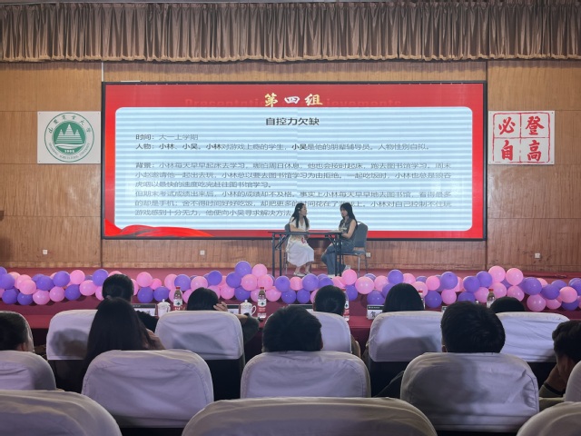 大赛以“朋燃心动,互助同行”为主题。经过前期选拔,最终有来自食科、植保、水土、机电、公管、经管、化学和外语学院的8支代表队进入决赛。比赛分为知识问答、活动分享和情景再现三个环节。在知识问答环节,选手们面对问题反应迅速,游刃有余;在活动分享环节,各团队选手讲述分享“兔子舞”、“看我报数”、“双向奔赴”等活动,展现朋辈团体辅导活动项目的丰富性和趣味性;在情景再现环节,各团队选手们围绕“宿舍矛盾”、“外貌焦虑”、“就业迷茫”、“新生适应”、“自控力欠缺”等大学生常见心理问题进行情景演绎,再现了大学生群体中存在的心理困惑,展示了朋辈心理辅导过程中的精彩技能。