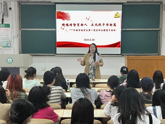 6月28日,外语学院学生第一、第二党支部书记分别在泮河校区N312、N314为学生党员讲授主题教育专题党课,同时开展“铸魂增智育新人 正风促干书新篇”主题党日活动。学院全体学生党员、2022级入党积极分子参加活动。