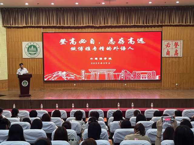 活动中,徐启豪院长以“登高必自,志存高远”为主题,从看见、责任、成才三个方面展开详细介绍。他首先介绍外语人才的培养目标、能力要求,推荐阅读书目,鼓励学生建立和强化外语专业身份认同,提升自主学习能力和跨文化交际能力。其次,介绍语言学习观,敦促学生苦练本领,提升外语能力。最后勉励学生担当时代重任,在实现民族复兴的赛道上奋勇争先,建立深远目标并为之奋斗,争做优秀的语言学者。