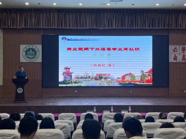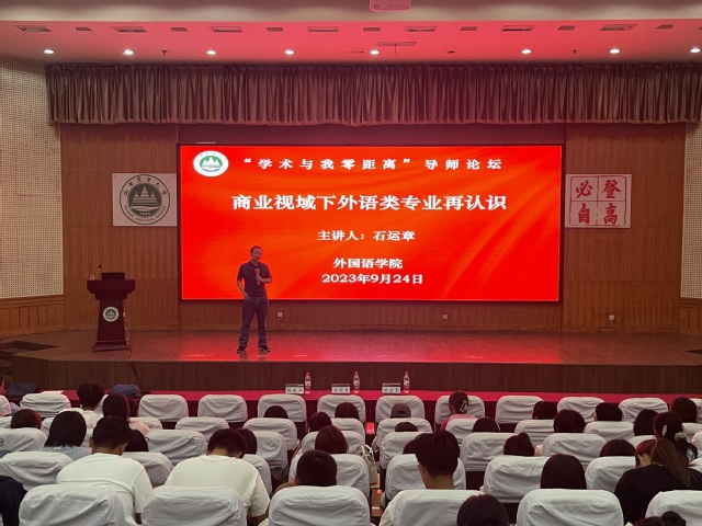 9月24日,外语学院在泮河校区第一学术报告厅举办导师论坛,学院教授委员会主任石运章教授为全体新生作专业认知报告。