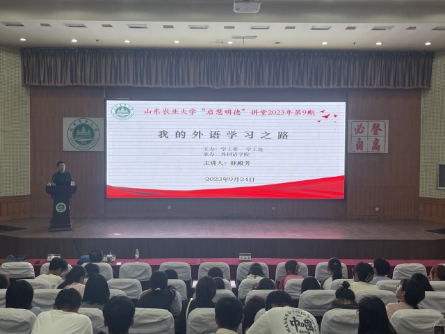9月24日,外语学院在泮河校区第一学术报告厅举办启慧明德讲堂,邀请优秀校友林殿芳为全体新生做报告。