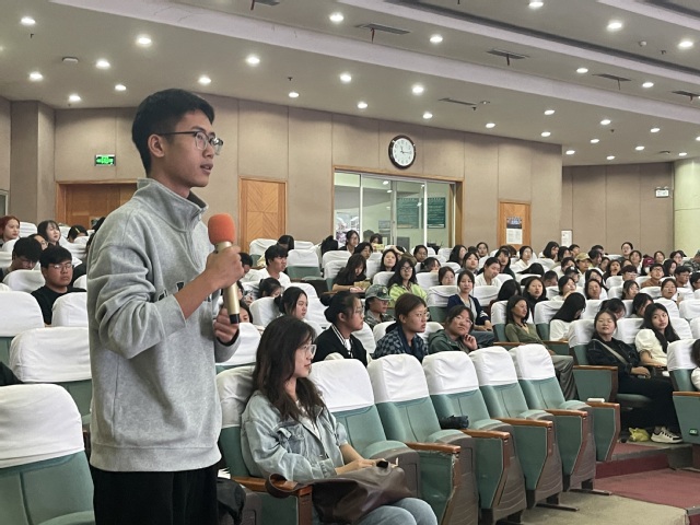 林殿芳以《我的外语学习之路》为题,从自身经历、语言专业学习和关于大学老师3个方面进行分享。他从两个目标为切入点,分享自己本科阶段的心路历程以及考研、考博励志经历。他强调外语学习的核心是过硬专业能力,要增强核心竞争力,提高专业技术和综合素质。随后,他向新生传授外语学习经验和方法,详细分析本科各阶段应如何进行语言学习规划,并且从就业、考研、出国3个方面分析就业方向。最后,他就如何成长为一名优秀的大学老师展开讨论,鼓励学生们立德、立志、立学、立身,早日成为有理想、敢担当、能吃苦、肯奋斗的新时代好青年。在互动环节中,学生们积极与林殿芳进行提问、交流,展开深层次讨论。