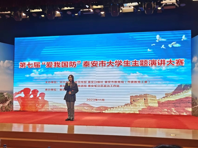 11月7日,第七届“爱我国防”泰安市大学生主题演讲大赛在泰安传媒集团顺利举行,2022级庄嘉仪荣获大赛优秀奖。