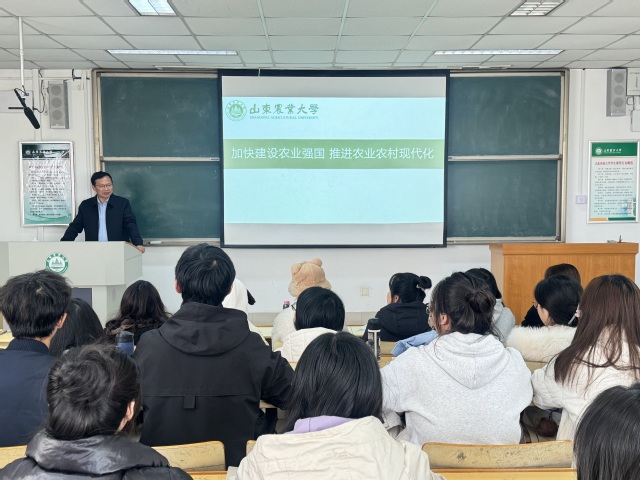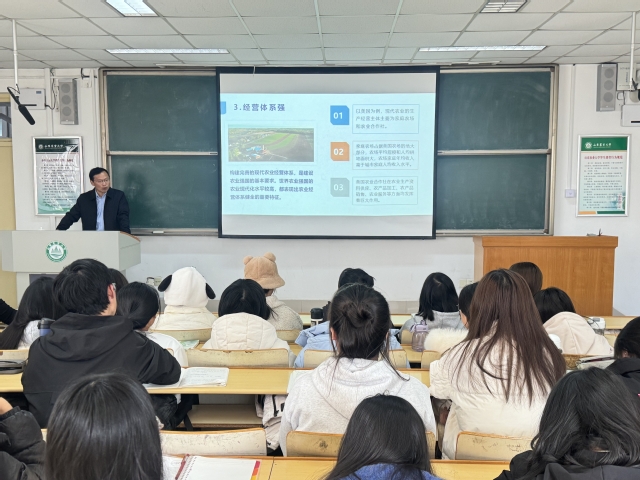 李广松以“加快建设农业强国,推进农业农村现代化”为主题,围绕加快建设农业强国的意义、农业强国的内含特征以及重点任务三大方面展开讲述。他强调,农业乃大国根基、民族命脉。处于世界新的动荡变革期,我国农业发展进程仍存在农业生产效率相对较低、农业从业人员整体素质不高等问题,使得我国建设农业强国的进程具有紧迫性。随后,他进一步阐释学校在推进农业农村现代化过程中的责任担当,以学校发展的鲜活事例引导外院学子认清形势、砥砺奋斗、勇于担当,依靠自己力量端牢“中国碗”,以钉钉子精神攻坚克难、稳定供给、加快农业转型升级,提升农业产业韧性和竞争力。