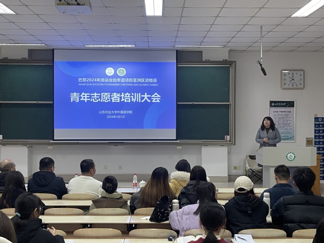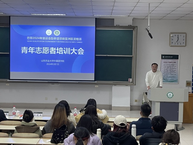 3月7日,外语学院在泮河校区N203举办巴黎2024年奥运会跆拳道项目亚洲区资格赛青年志愿者培训大会。泰安市外事办、市体育运动学校、市体育产业发展中心、学院相关负责人和全体志愿者参加培训。