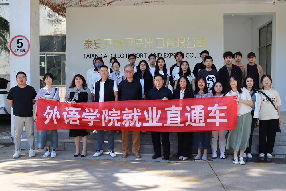 5月15日,外语学院开展泰安专场“就业直通车”活动,走进泰安东升服装有限公司和泰安科鼎特工贸有限公司访企拓岗促就业,与泰安科鼎特工贸有限公司共建就业实习基地。学院党委书记胡化坤、院长李伟、党委副书记费美娟、辅导员及部分2024届毕业生参加活动。