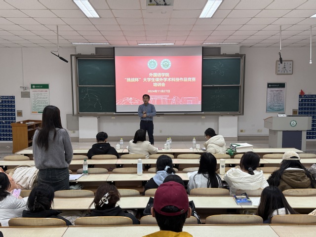 11月27日,外语学院在泮河校区综合楼N203开展“挑战杯”大学生课外学术科技作品竞赛专题培训讲座。本次讲座特邀经济管理学院副院长牛浩进行专题培训。学院党委副书记费美娟、全体辅导员及各项目成员参加讲座。