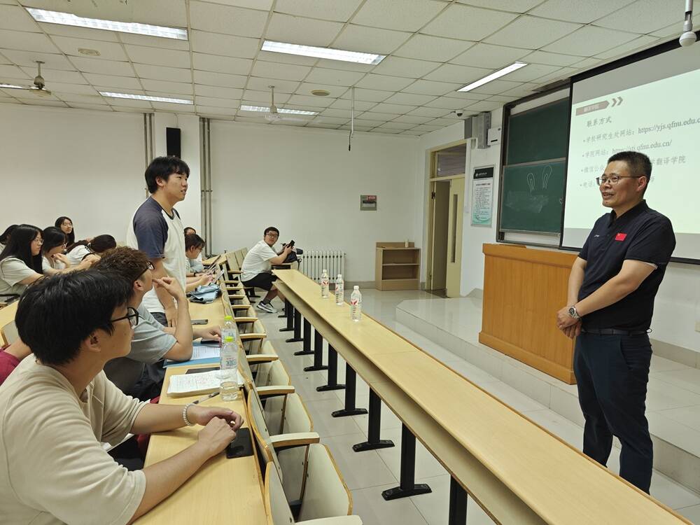 会上,曲阜师范大学翻译学院副院长、日语系主任、教授、硕士研究生导师宋晓凯从学校深厚的办学历史切入,向同学们讲述学校在多年发展历程中积淀的文化底蕴与学术传统。随后,围绕学科专业、师资力量、教学环境等、方面展开详细介绍。他重点阐释了曲阜师范大学翻译学院独特的学科优势与培养模式,强调了学院在课程设置上的科学性与前瞻性。东北林业大学外国语学院英语系主任孙立轩、MTI负责人华裕涛就学科特色、科研成果、研究生培养方案等多个方面,使同学们明晰东北林业大学外语学科的发展现状与前景。在答疑环节,现场气氛热烈。同学们就报考条件、奖助政策、就业前景等问题踊跃提问,三位老师耐心细致地逐一解答。最后,三位老师向在场学生发出诚挚邀请,鼓励大家积极报考,不断提升专业素养与学术能力。
