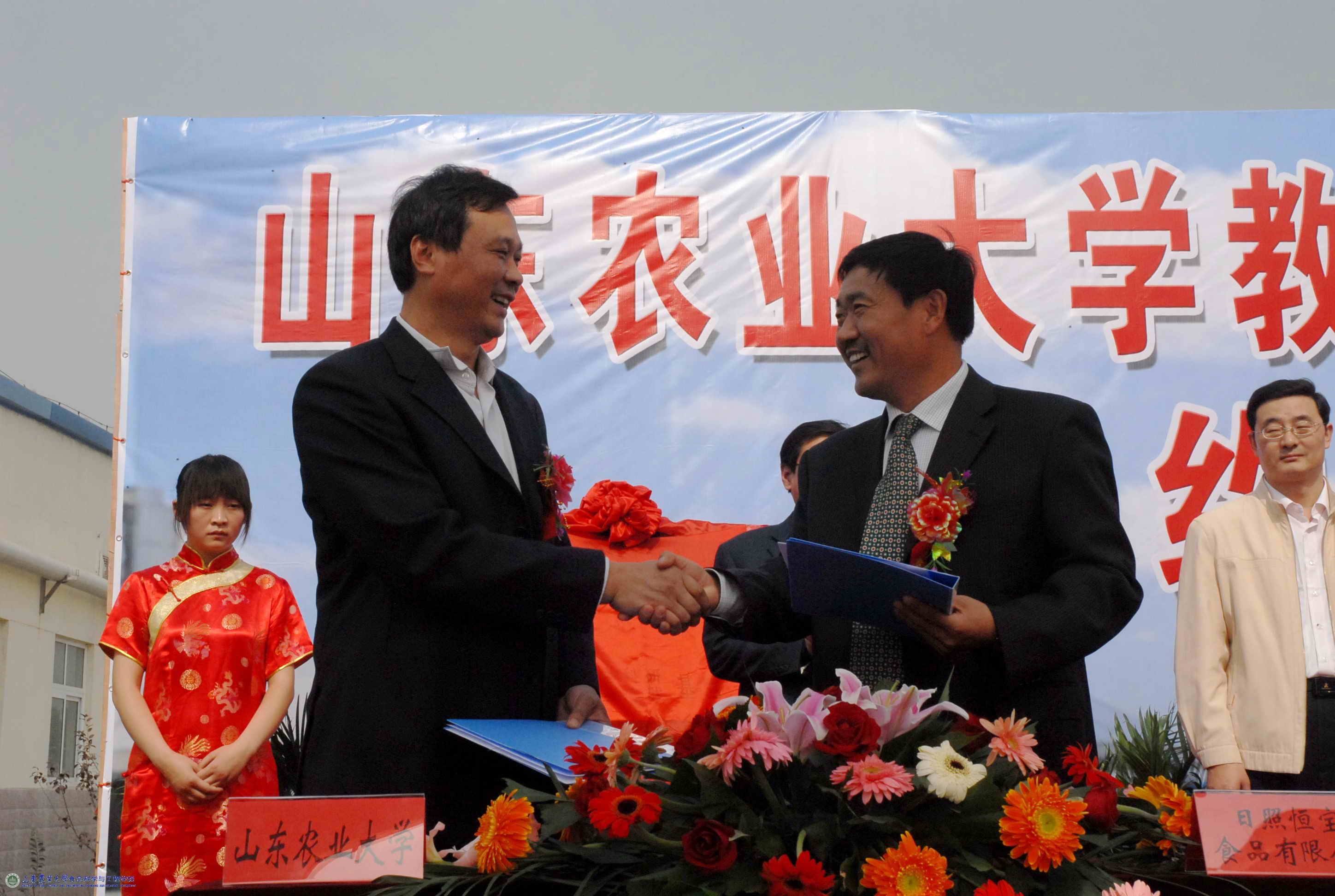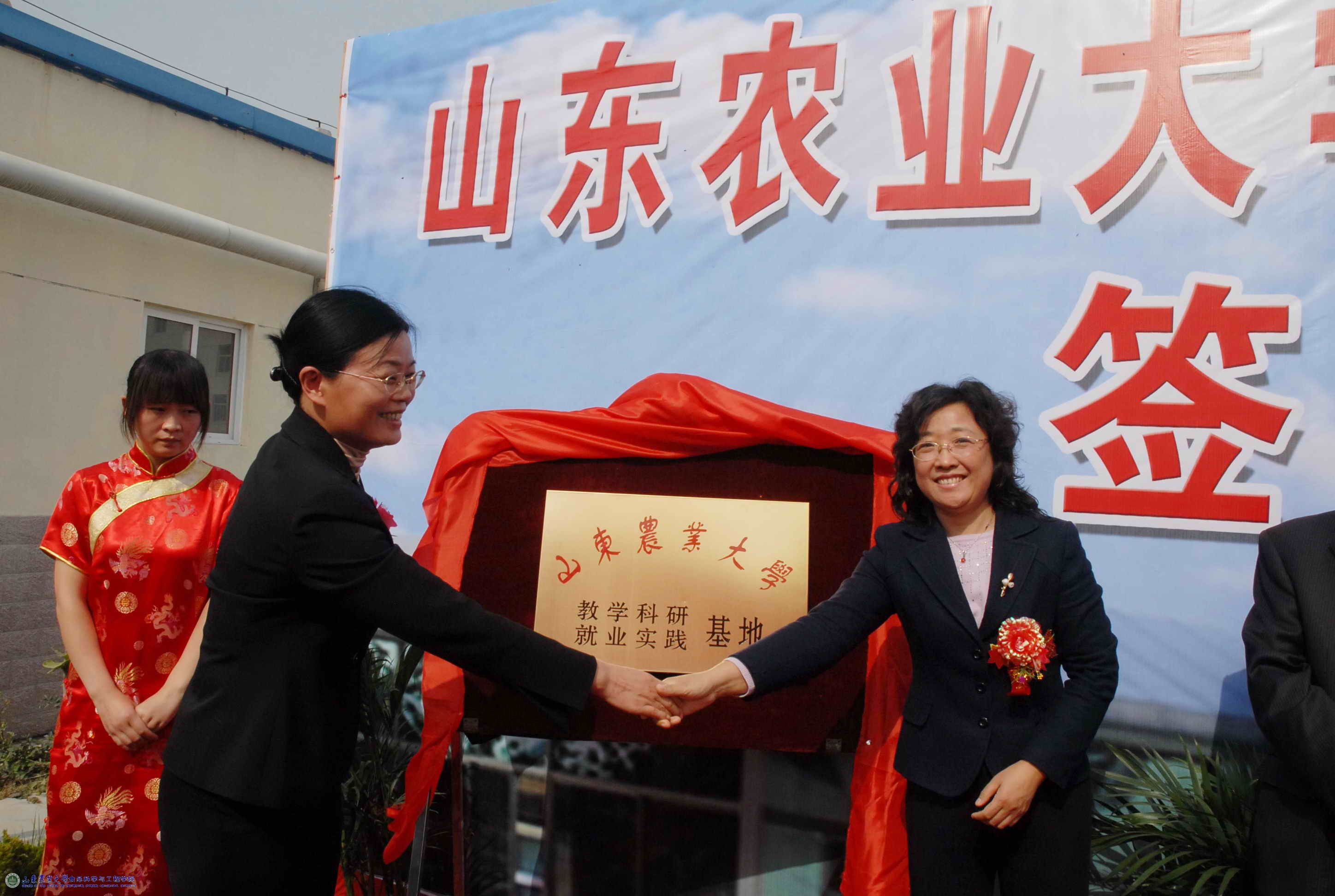 山东农大学生工作处处长朱莉、日照市农业局副局长韩玉凤为教学科研与就业实践基地揭牌。山东农大食品科学与工程学院院长董海洲、恒宝食品有限公司董事长兼总经理申恒宝在合作协议书上签字。山东农大食品科学与工程学院党委副书记田保状、莒县副县长匡立福分别讲话,祝贺山东农大教学科研与就业实践基地落户恒宝食品有限公司,并希望校企合作,共同发展,实现双赢。