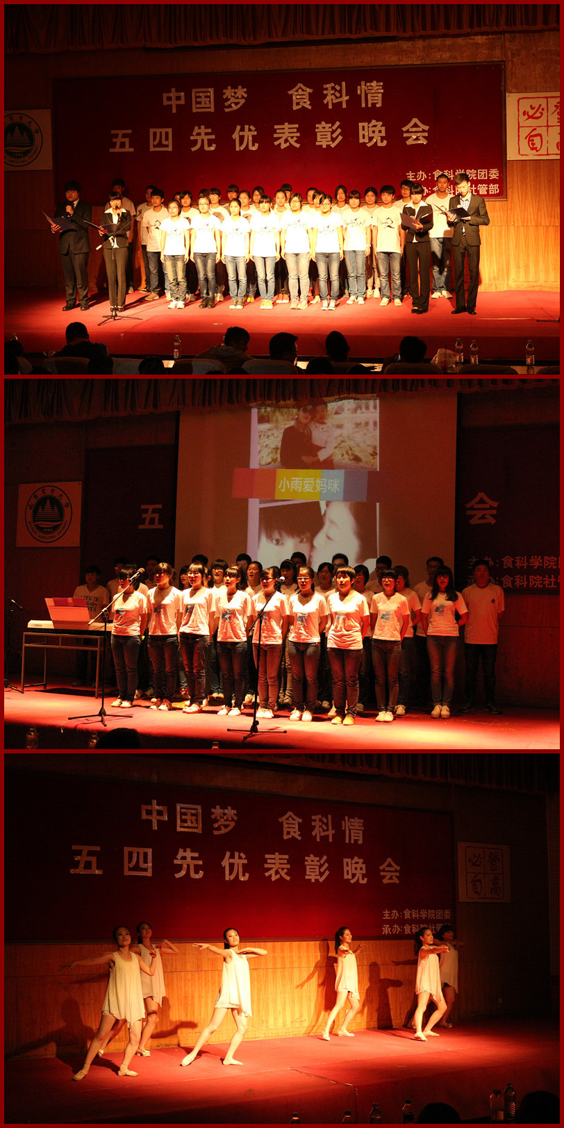 5月11日晚,由食科学院团委主办,食科学院社管部承办的“中国梦,食科情”五四先优表彰晚会在南校区图信楼第一学术报告厅隆重举行,学院党委书记于林、副书记赵明月以及学院团委全体老师和2013级全体同学一同参加了颁奖晚会。