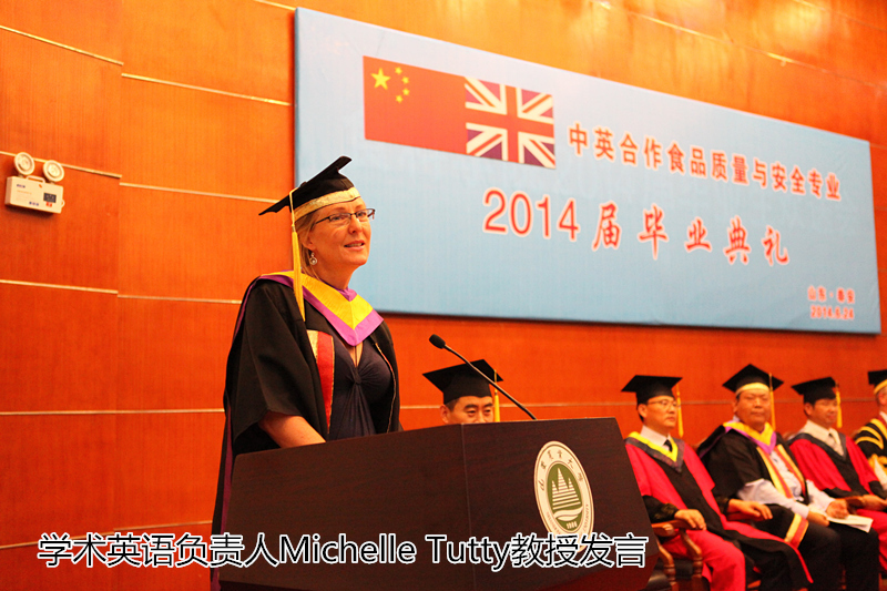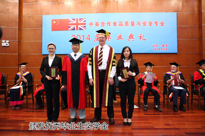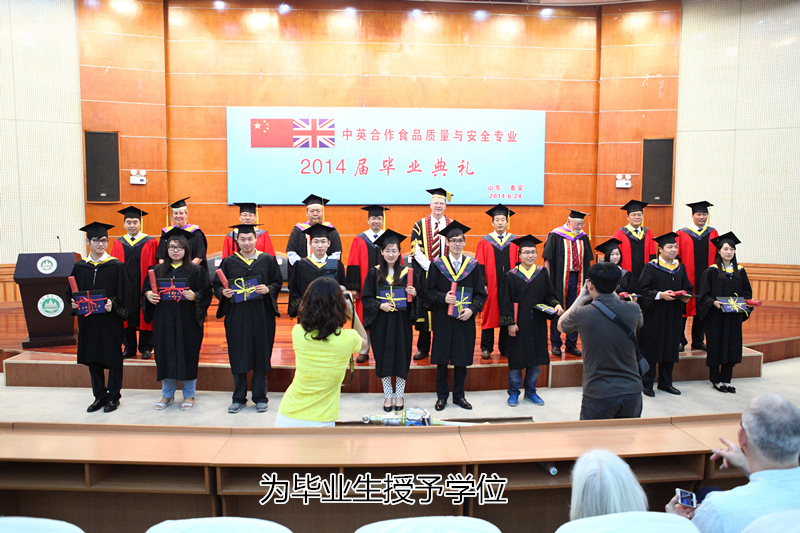 6月24日上午,学校隆重举行中英合作食品质量与安全专业2014届学生毕业典礼。山东农业大学副校长张宪省,英国皇家农业大学中国区主管王啸宇,英国皇家农业大学国际学院院长Jonathan Turner,学术英语负责人Michelle Tutty教授,教师代表Howard James(Ted Carter)教授、Elizabeth Carter教授,以及我校有关部门和食品学院的负责同志出席毕业典礼。