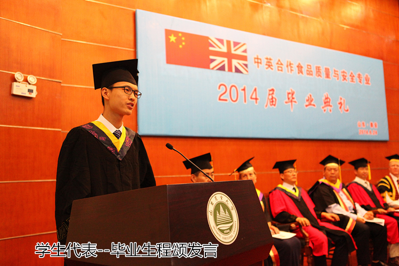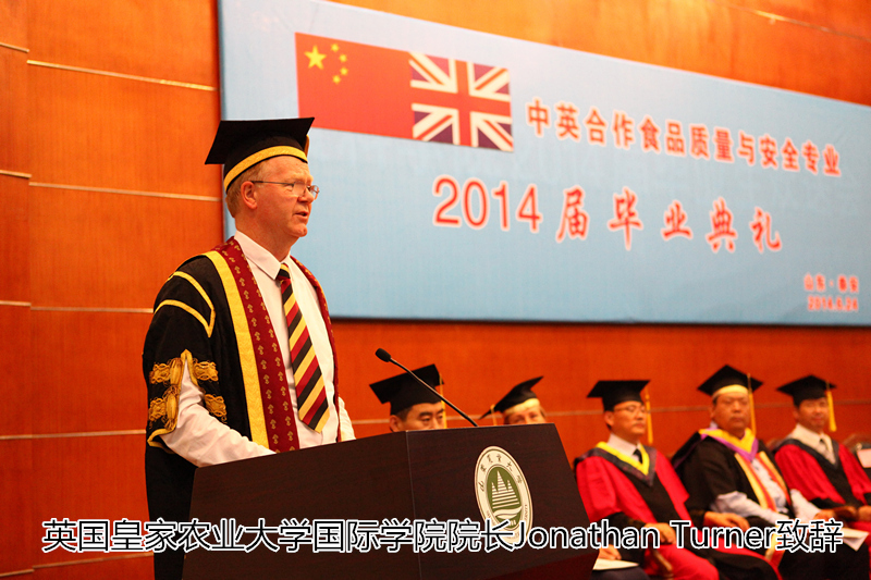 Jonathan Turner在致辞中说,在过去十年间,山东农业大学和英国皇家农业大学已经建立了深厚的友谊,并在学术合作方面取得了杰出成果。我们很高兴地宣布,英国皇家农业大学与贵校的合作已经在去年8月份扩展到资源与环境学院的土地资源管理专业,该专业已于去年开始招生。此外,我们已经就两所大学其他项目提出合作意向,希望新的合作在不久的将来得以实现。中英合作班毕业生接受了国际不同文化的教育和技能培训,能够应对当前以及未来的挑战,并且在其选择的职业生涯中有更加优异的表现。皇家农业大学在全英国大学中毕业生就业率排名前十名,我们非常愿意把其中一些就业岗位机会提供给山东农业大学的学生们。过去几年间,食品科学与工程专业的毕业生就业率比较高,这说明贵大学设计和开发这样新的合作课程的理念是非常正确和成功的,并且我们也看到了学生们勇于尝试并坚持学习中英新型合作专业的决心和勇气。Jonathan Turner祝愿各位毕业生在未来的事业或学习中取得丰硕成果。