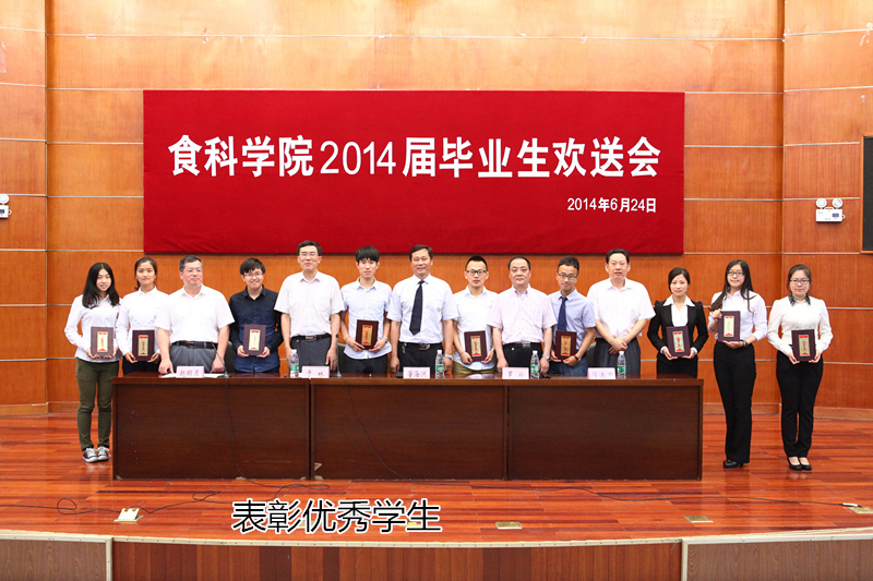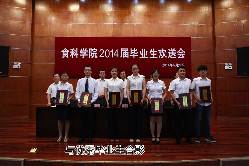 毕业生欢送会在庄严的国歌声中拉开帷幕。首先,优秀毕业生代表张博华发表了毕业感言,总结了大学四年的所思、所学、所获、所悟,饱含深情地表达了对母校的深深眷恋以及对老师,师长的感恩。随后,在校生代表翟朝宇表达了对师哥师姐三年帮助的感谢,并祝福他们前程似锦,事业有成。紧接着,食科学院院长董海洲为毕业生颁发毕业证书和学位证书,与学生代表合影。欢送会上,学院对省级、校级优秀毕业生,对帮扶就业贡献突出的学生党员,对班级签约就业率达100%班级的班长团支书进行了专门表彰和奖励。食科学院党委书记于林发表了热情洋溢的讲话,鼓励同学们树立正确的人生理想观念,有信心,有决心,培养强烈的事业心和社会责任心,不断提高自身创新能力,为实现中国梦,做出食品人应有贡献,并祝福2014届毕业生一生幸福平安,事业有成。