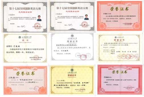 创新创业比赛荣获:第五届“萌番姬”杯国际大学生农业创新创业大赛“最具潜力团队”奖(全国第七名)、第四届“互联网+”大学生创新创业大赛校赛三等奖、山东省科技创新大赛校赛优秀奖、创新创业奖学金。