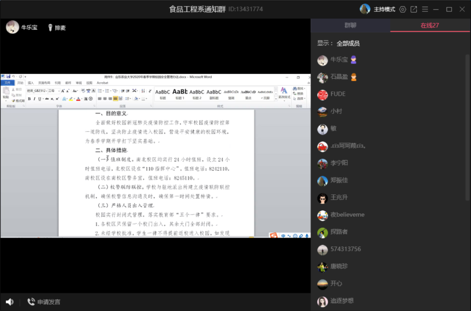 3月30日晚,食品工程系共27位教师通过QQ群课堂参与防控新冠肺炎疫情知识和技能线上培训,会上牛乐宝首先传达《关于加强全校师生员工防控新冠肺炎疫情知识和技能培训的通知》(山农大疫控组字[2020]17号)文件精神,针对附件1《高等学校新型冠状病毒肺炎防控指南》;附件3《学校开学前疫情防控规范培训特别节目》;附件4《新型冠状病毒肺炎防控知识手册》;附件5《山东农业大学校医院新型冠状病毒感染的肺炎消毒工指南》进行了有重点性的领读学习,其次针对附件6《山东农业大学办公楼、教学楼、实验楼疫情防控工作须知》;附件7《山东农业大学学生公寓疫情防控工作须知》;附件8《山东农业大学疫情期间学校餐厅就餐须知》;附件9《山东农业大学 2020 年春季学期校园安全管理办法》进行了领读学习;最后大家进行了对文件的解读和感受进行了交流。