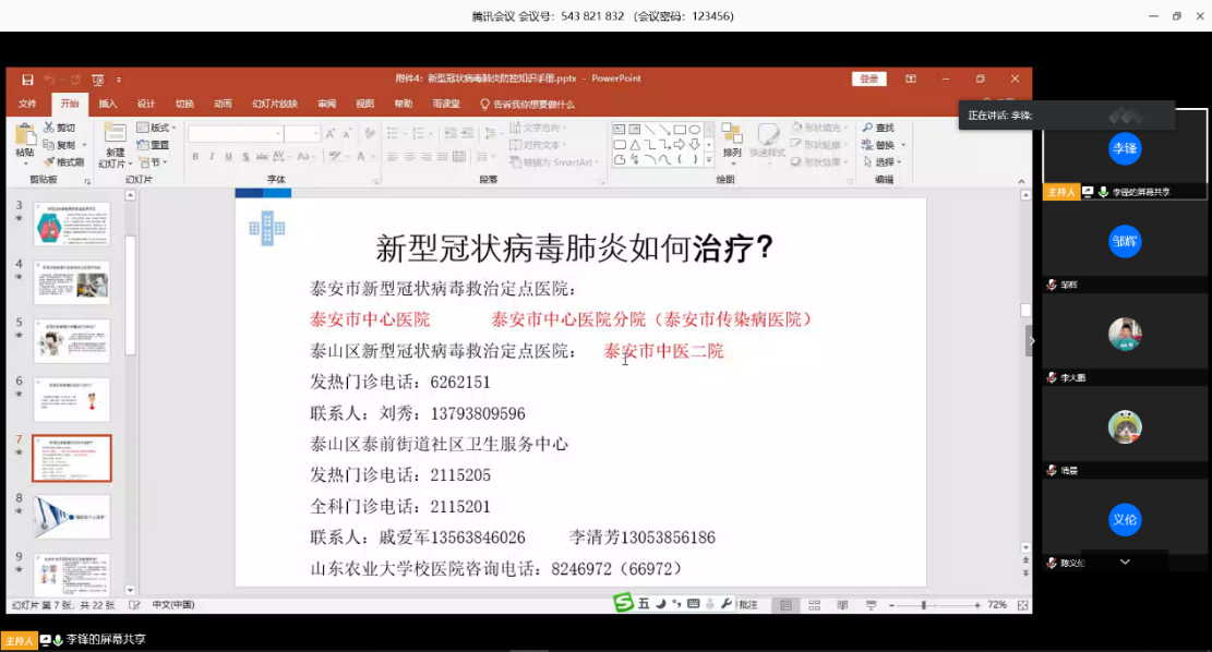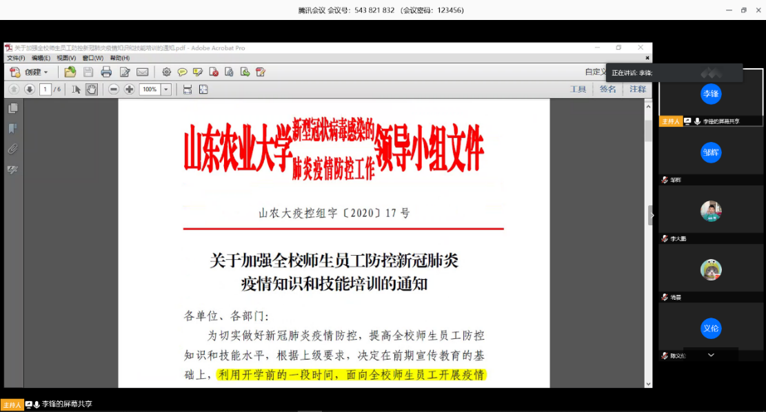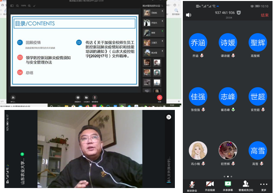 二是组织全体班主任和研究生导师研讨线上培训流程。3月30日下午,在线上培训会中,传达了《关于加强全校师生员工防控新冠肺炎疫情知识和技能培训的通知》(山农大疫控组字[2020]17号)文件精神,对《高等学校新型冠状病毒肺炎防控指南》《学校开学前疫情防控规范培训特别节目》《学校开学前疫情防控规范培训特别节目》《山东农业大学校医院新型冠状病毒感染的肺炎消毒工指南》等四个文件进行学习,同时对《山东农业大学办公楼、教学楼、实验楼疫情防控工作须知》《山东农业大学学生公寓疫情防控工作须知》《山东农业大学疫情期间学校餐厅就餐须知》《山东农业大学 2020 年春季学期校园安全管理办法》进行了逐字逐句领学。