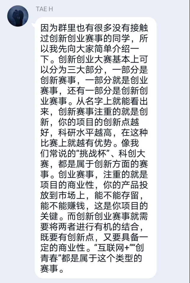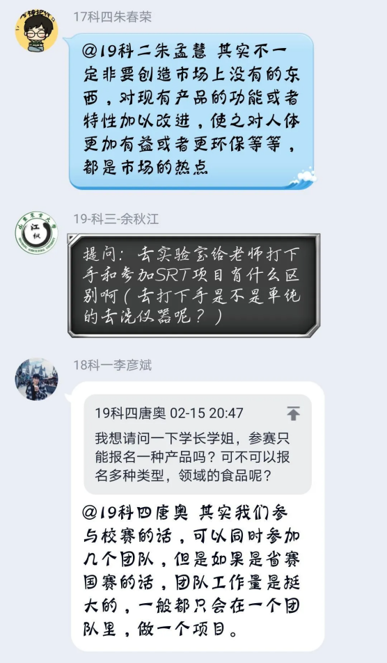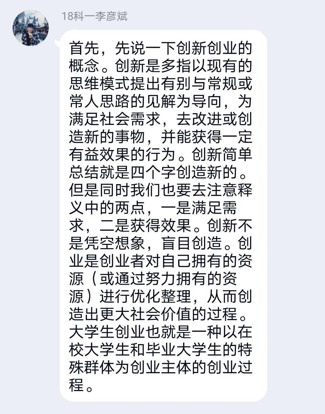 18食安三石莹莹反馈说到,假期的最后几天,有了“假期课堂”的陪伴,没有那么无聊了,对我也有很大的帮助。学长学姐们从创新创业想法来源到如何立项讲的很仔细,想法还是来源于兴趣,兴趣是最好的老师,找到自己感兴趣的项目,可能会事半功倍。大一的我很少参加创新创业的比赛,“小课堂”的哥哥姐姐鼓励我们放手去做,对自己我也有了信心,虽然大二的我开始的有点晚,但觉得只要有一颗积极探索的心,什么时候都不晚。加油!