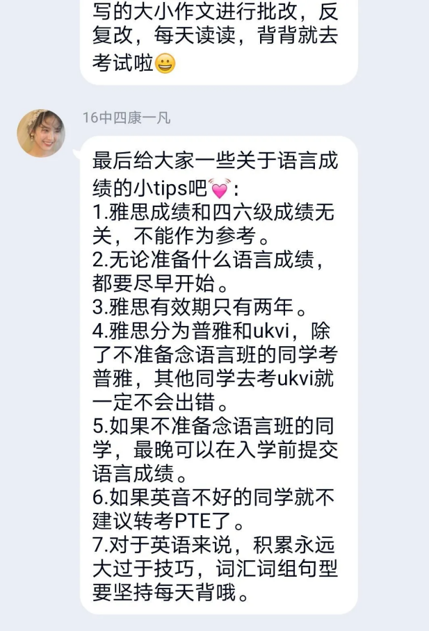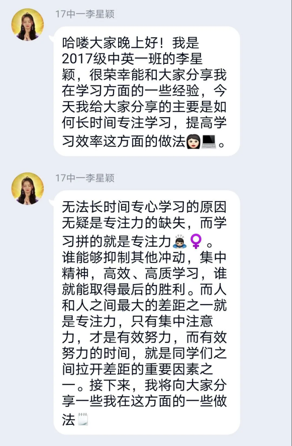17中一高孜娴反馈说,非常有幸能够聆听三位学姐的经验分享,出国留学是一个很有意义的选择,通过小课堂的学习,我对出国的利弊有了更全面的了解,也知道了具体的流程以及如何提升、包装自己,明确了努力的方向。在增长经验的同时,我也对未来有了更清晰的规划,对留学之路更加坚定,为自己的未来更加努力。
