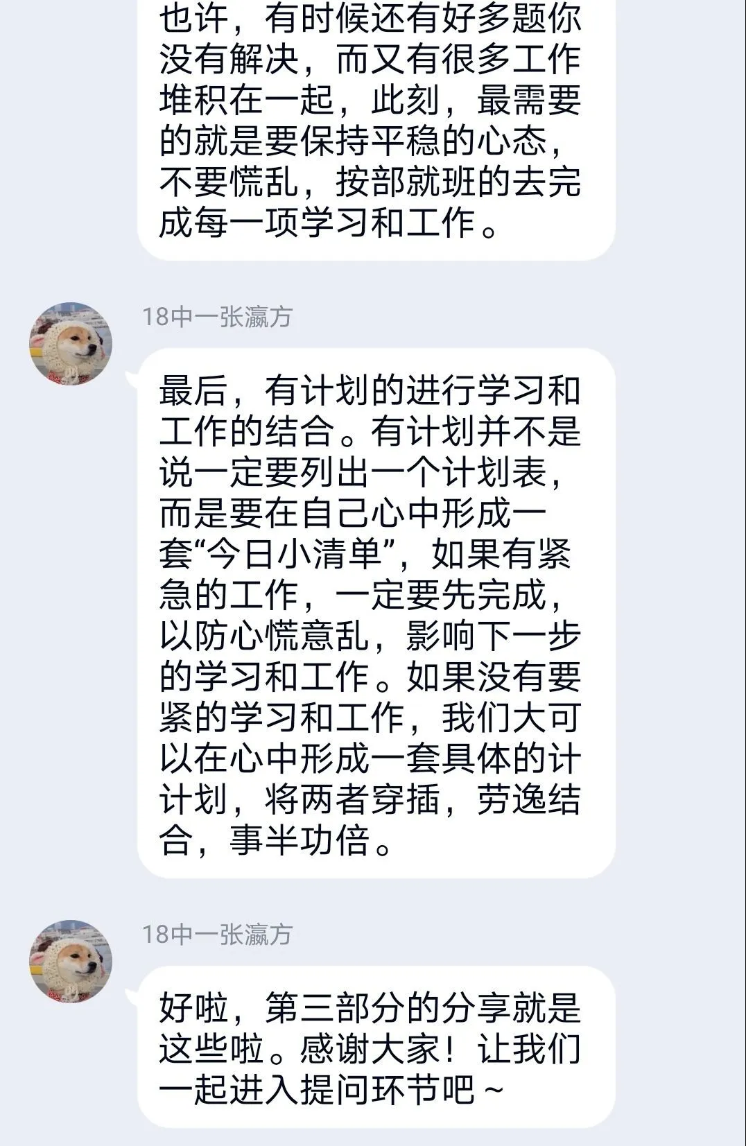 18科四陈志强:本次小课堂中学长学姐的学习经验分享使我受益颇多。在今后的学习中,我一定会将这些学习经验相互融合、实践,不断完善、提高自己的学习能力。