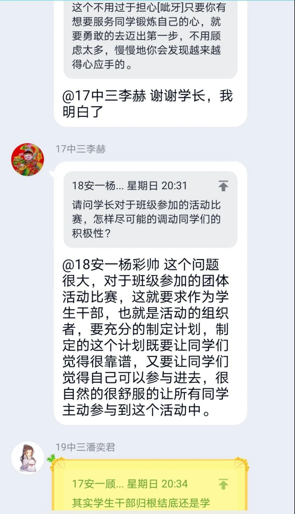 19中三潘奕君反应,通过在本次小课堂的学习,我在学生工作与学习的权衡上深有感触,学习与工作的时间安排很重要,我们要合理分配。学到了许多灵活处理工作与学习关系的方法,懂得了面对学生工作,要保持炙热,坚持下去,担起这份责任,全身心的投入,认真做到极致。我今后要以党员干部的要求来激励自己,与同学们和谐相处,互帮互助,对学生工作深存敬畏之心。