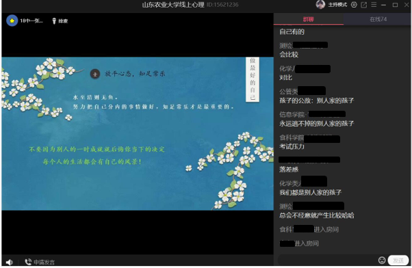 两期活动中,涉及情绪调节、如何与家人相处、如何更好的处理友情和爱情等多个方面的话题,同时也涉及了在疫情期间我们应该怎样更好的去调节心态等多方面的内容。同学们都能够积极跟随活动发表个人见解,与其他参与课堂的同学进行讨论,与带领人进行线上互动,课堂氛围有趣而温暖!