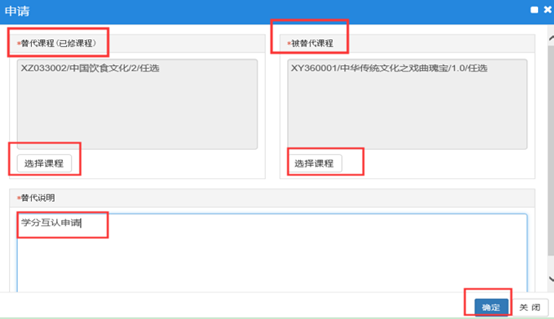 3、选择替代课程(重修课程、补修课程等,系统已自动屏蔽培养方案内课程)、被替代课程(培养方案内课程)、填写替代说明,点击确定。