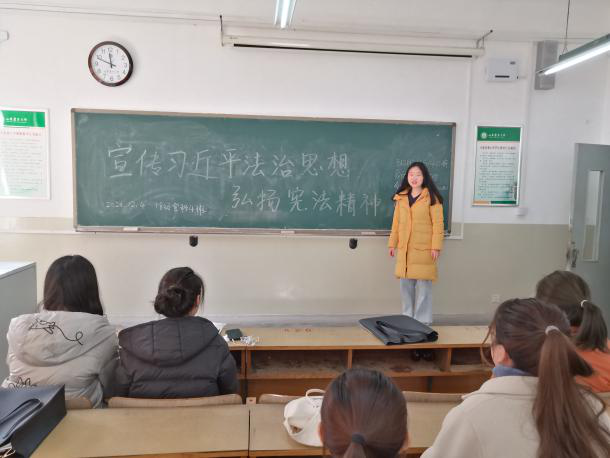 活动期间,学生预备党员积极切实开展宪法宣传教育工作,形成普法宣讲队,共有23名学生预备党员,走进全院51班级进行普法宣传,实现各年级班级全覆盖。从宪法文本入手,带领各班同学学习和理解原文。其中,重点学习宣传国家的根本制度和根本任务、公民的基本权利和义务以及国家生活的基本原则,突出对宪法修正案具体内容的宣传,使宪法确立的重大制度和原则内化于心、外化于行。