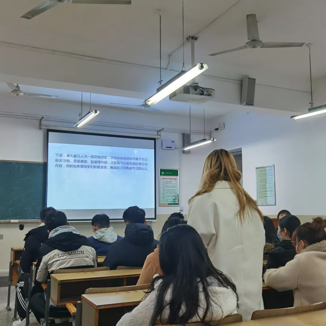 此次班会中部分班级创新方式方法,采取分组讨论、事例讲解等方式提升效果,2020级食科五班、中英一班和2018级中英一班在开展主题班会的过程中,同学们分组讨论节日习俗、历史典故、起源等内容,之后各个小组互相分享讨论内容。2020级中英一班团支书邴博雅为班级同学讲解春节、端午节等节日背后的传统文化故事,简单介绍西方节日背后的文化背景,通过故事让同学们正确认识“节日”背后的文化,加深对传统文化的理解。