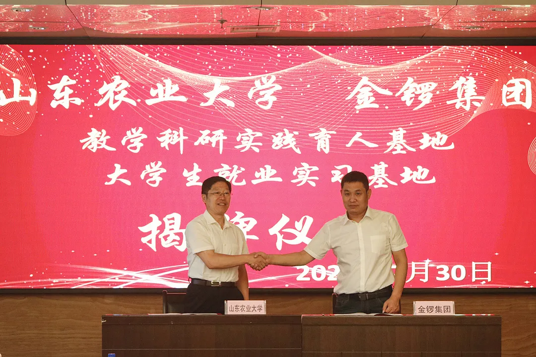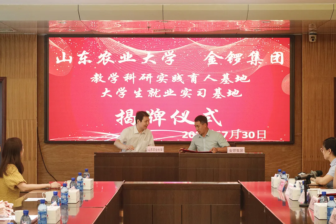 7月30日上午,山东农业大学“教学科研实践育人基地”和“大学生就业实习基地”揭牌仪式在临沂金锣集团举行。山东农业大学副校长辛杰与临沂市兰山区区长沈如茂共同为基地揭牌。
