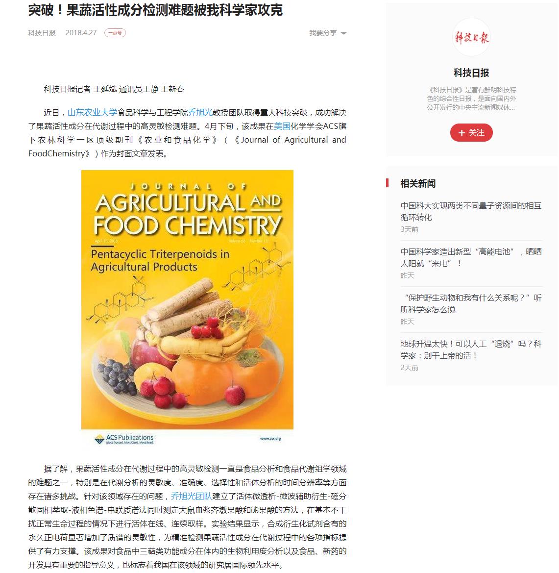 | Simultaneous Determination of Oleanolic Acid and Ursolic Acid by in Vivo Microdialysis via UHPLC-MS/MS Using Magnetic Dispersive Solid Phase Extraction Coupling with Microwave-Assisted Derivatization and Its Application to a Pharmacokinetic Study of Arctiumlappa L. Root Extract in Rats  | Journal of Agricultural and Food Chemistry  | 乔旭光(通讯作者)  |
