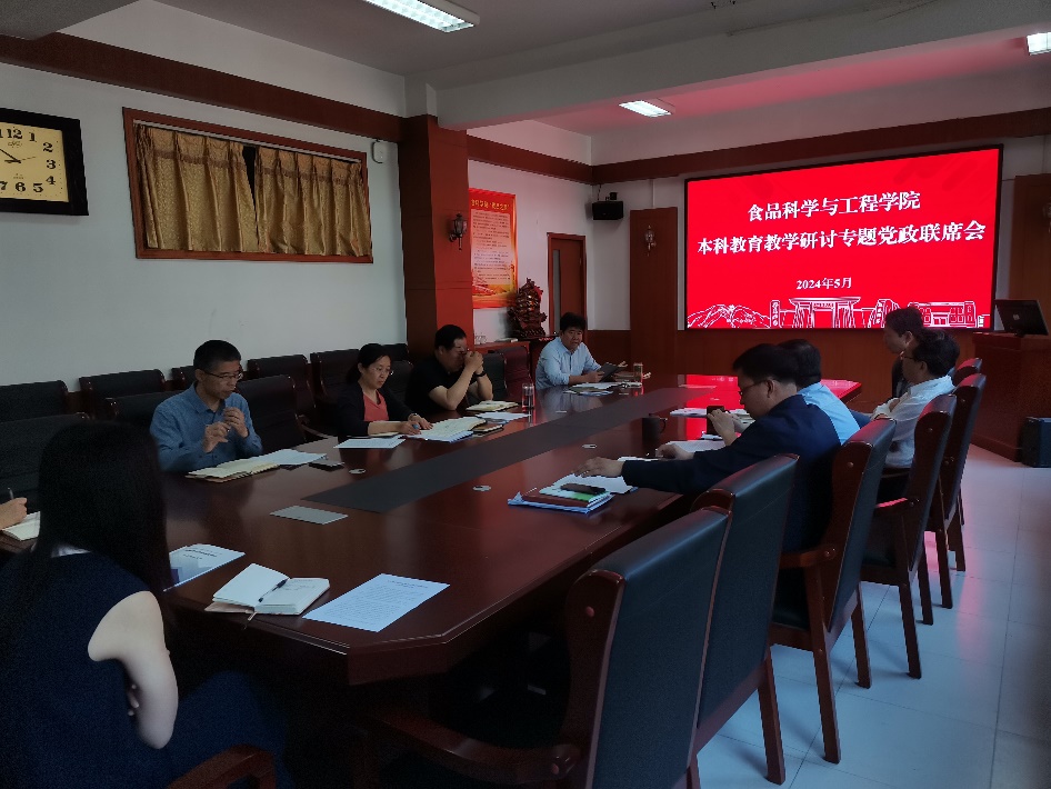 2024年5月11日上午,食品科学与工程学院在9号楼2楼会议室召开本科教育教学研讨专题党政联席会(扩大会议),学院领导班子全体成员、学院本科教育教学督导组成员、教授委员会委员、专业主任参加会议,会议由院长李大鹏主持。