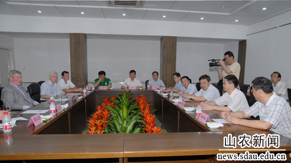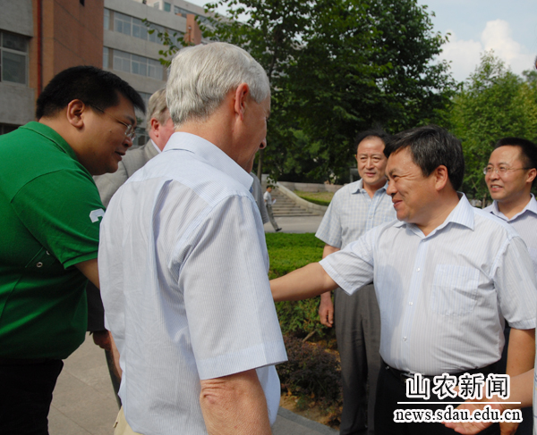 7月1日下午,党委书记苗仲华、副校长张宪省会见了西蒙•波特和克里斯•加思卡一行,副校长张宪省陪同客人参观北校区和南校区。苗仲华说,7月1日是中国共产党的生日,也是我们中英双方合作办学收获的日子。这一届的学生非常优秀,108名毕业生中,有63人考取了国内外研究生,就业的同学有的考取了国家机关、省机关公务员,有的在中粮集团、正大集团等大型企业工作,整体就业率达99% 。我们双方的合作成果丰硕,希望将来能拓展更大的合作空间,在师资进修、研究生培养等多方面开展更加广泛的合作。苗仲华还向大家介绍了山东农业大学的办学规模、学科设置及校区布局情况。