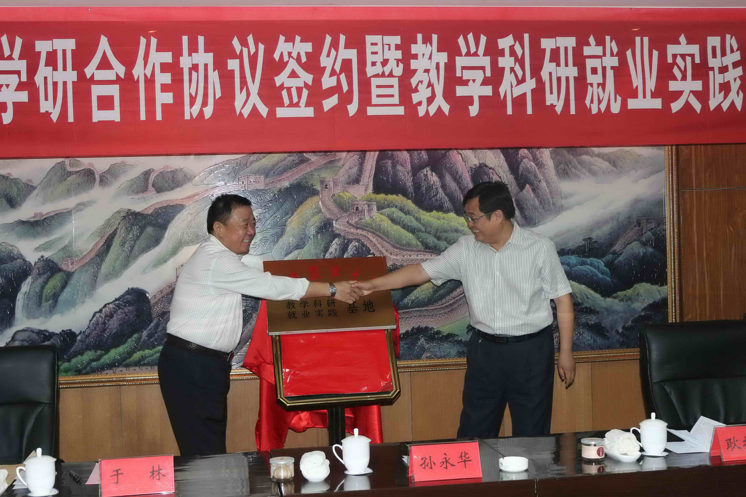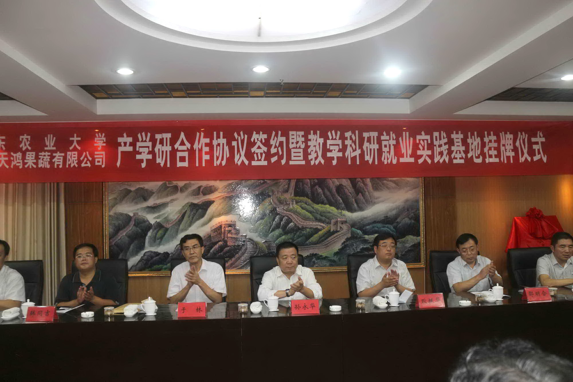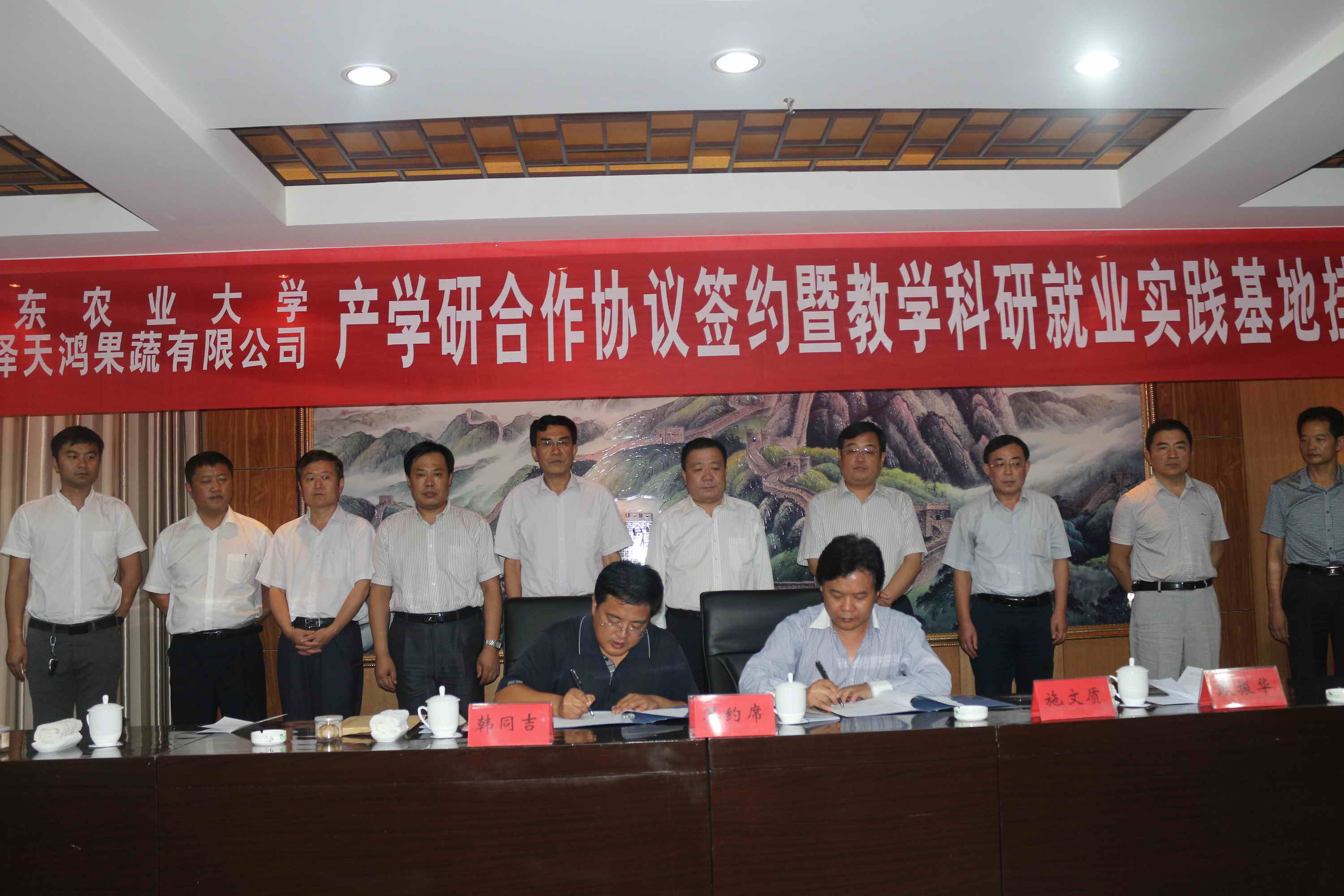 9月14日,山东农业大学食品科学与工程学院教学科研与就业实践基地揭牌仪式在菏泽天鸿果蔬有限公司举行。副校长孙永华和成武县委副书记、代县长耿振华同志为基地揭牌。学工处副处长韩同吉与菏泽天鸿果蔬有限公司董事长施文质就基地合作签订协议书。成武县县政府副县长绍明合、曹鸿祥,菏泽天鸿果蔬有限公司董事长施文质,学工处、食科学院、生命科学学院负责人,成武县农业局、经信局、科技局、大田集镇相关负责人出席挂牌仪式。