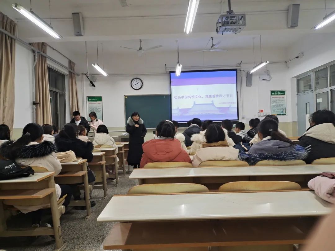 第三次主题班会——“弘扬中国传统文化,理性对待西方文化”也顺利开展。此次班会由班主任徐老师总结近期班级情况,并宣布班会开始。团支书张羽首先展示“弘扬中国传统文化,理性看待西方节日”的PPT并进行讲解,紧接着宣传委员李晓楠介绍中国传统节日历史的由来、习俗以及寓意,然后由班长周子渝介绍传统节日的菜肴,传统服装和乐器等来增强文化自信。最后班主任总结发言,我们要强大中国的文化自信,让中华民族优秀的传统文化在世界文化洪流中站稳脚跟,是我们不可推卸的责任。此次班会是大一上的最后一次班会,临近期末,学习委员宋丽莹进行了期末动员,倡导大家认真备考,诚信应考,最后祝愿每个人都能考出优异的成绩!