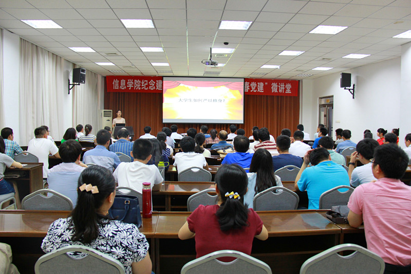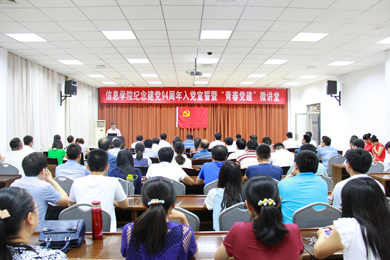 6月29日下午,信息学院庆祝建党94周年入党宣誓暨“青春党建”微讲堂活动在文理大楼第二会议室举行。副校长吴衍涛出席会议,有关部门主要负责人、学院党委委员、学院全体师生党员参加了会议。会议由学院党委书记李广松主持。
