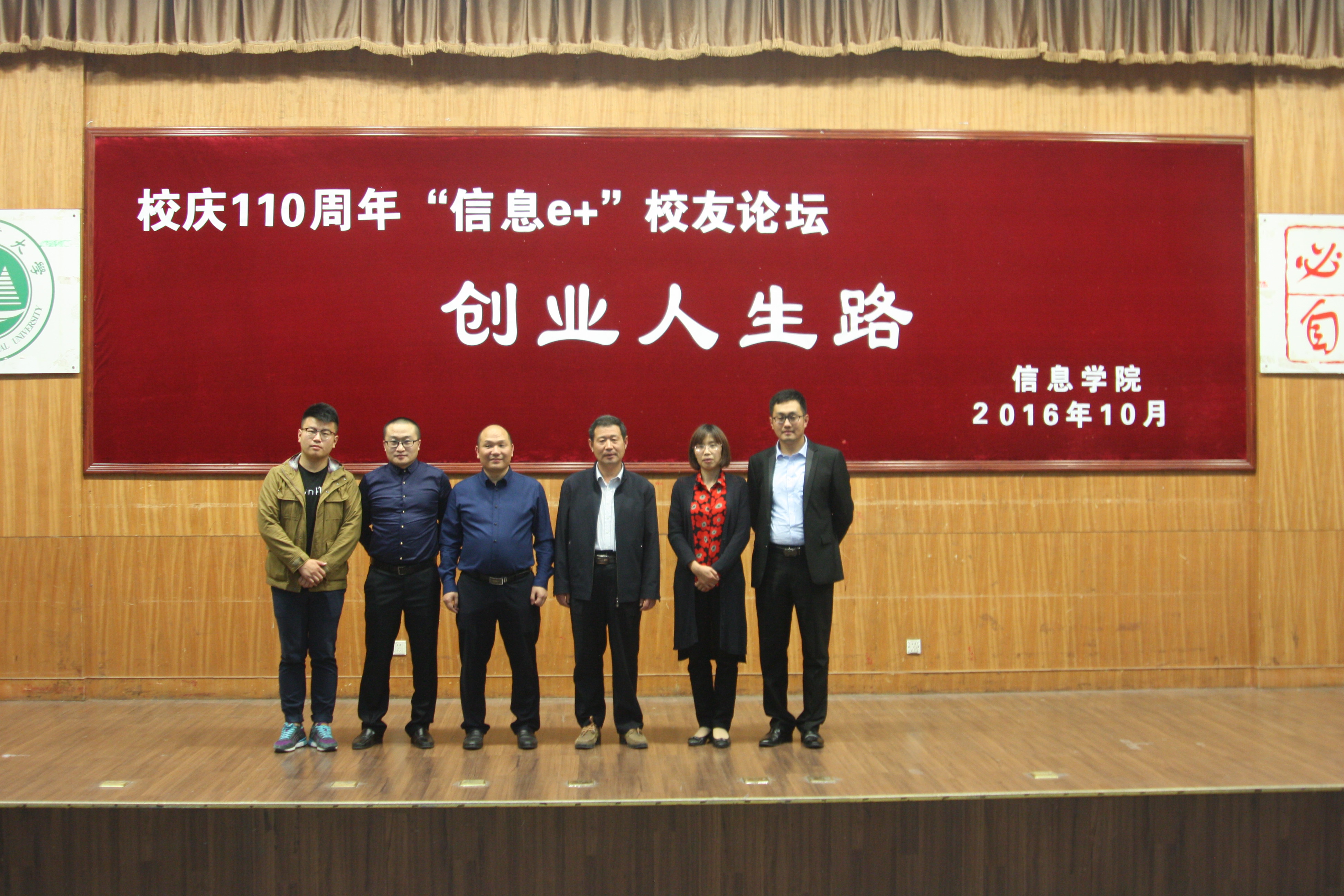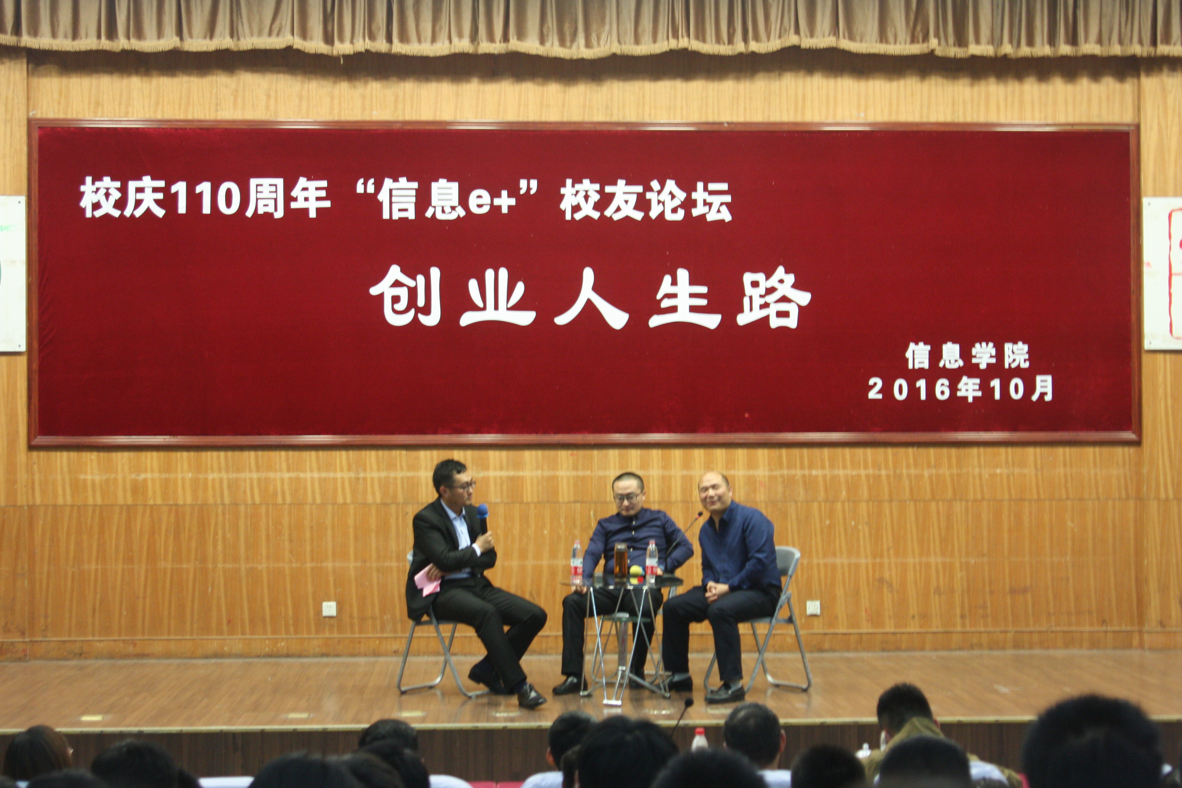 1014日下午,信息学院于南校区图信楼第一学术报告厅成功举办校庆110周年“信息e+”优秀校友论坛之创业人生路主题访谈,特邀07届优秀校友——山东省地质测绘院北方分院院长牛冲、商洛市信宇实业公司总经理魏双全担任嘉宾信息学院2016级全体学子共同参与。