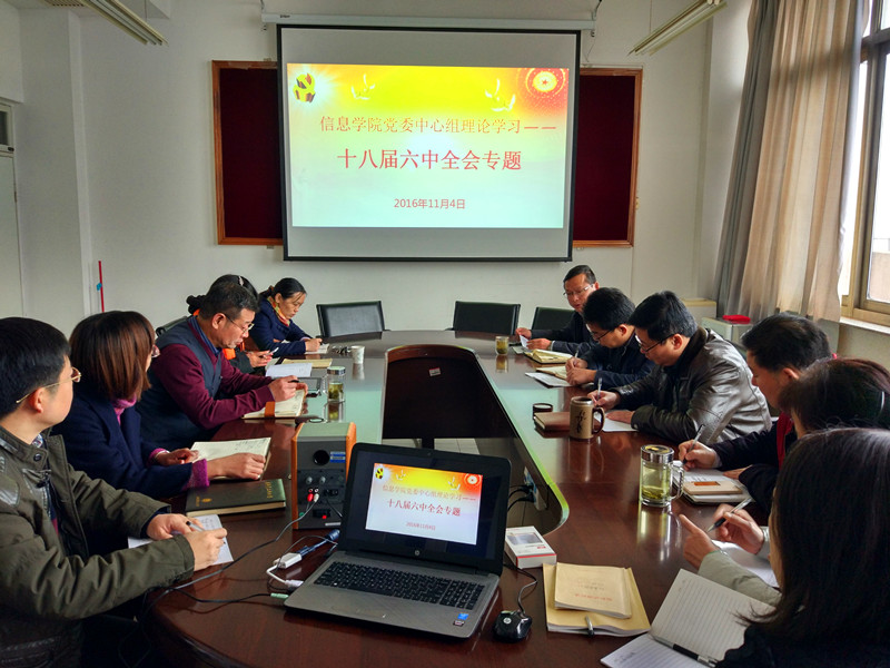 11月4日上午,信息学院党委中心组在文理楼1202会议室集体学习十八届六中全会精神。学院党委委员、各党支部书记参加学习。