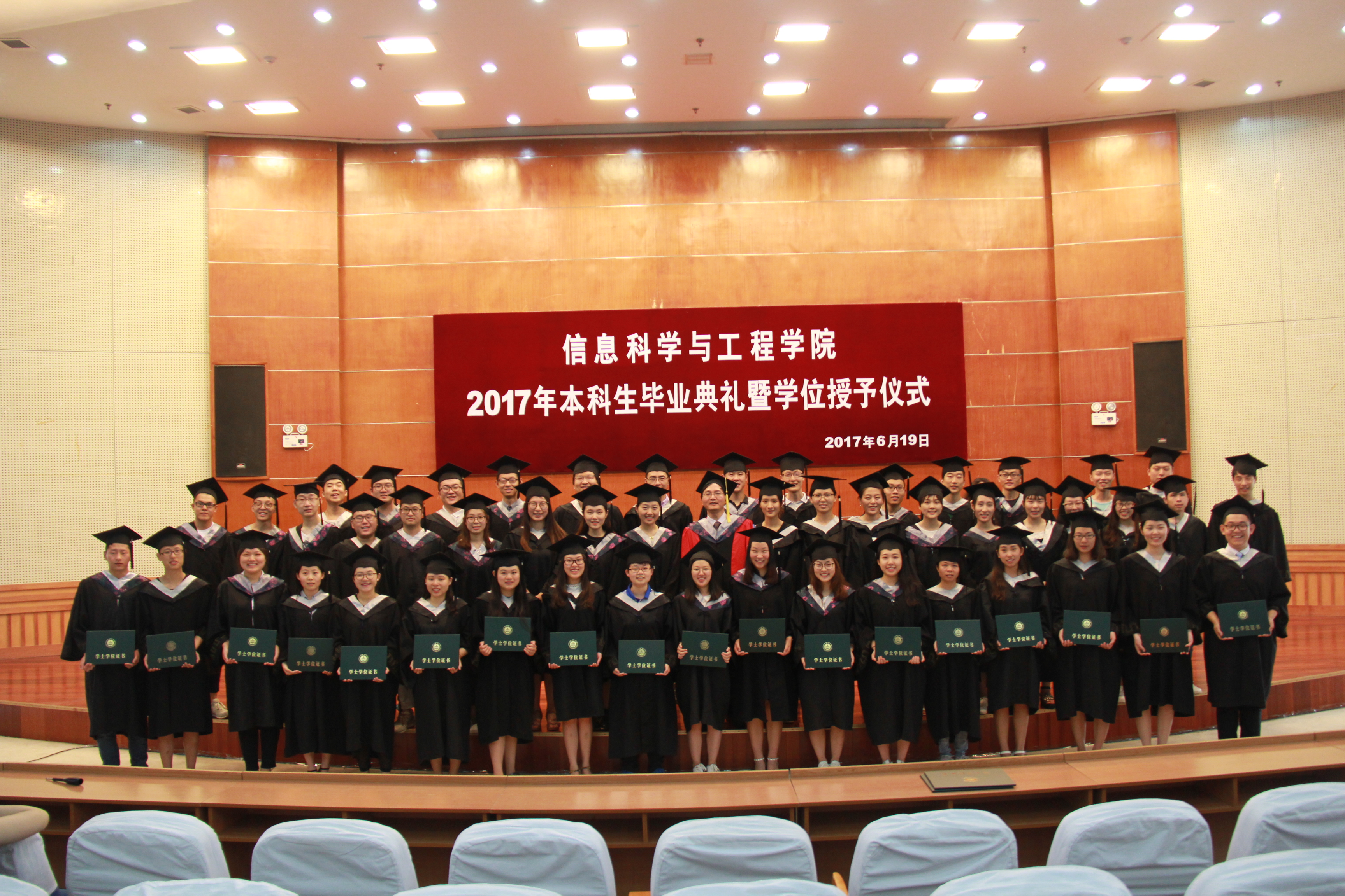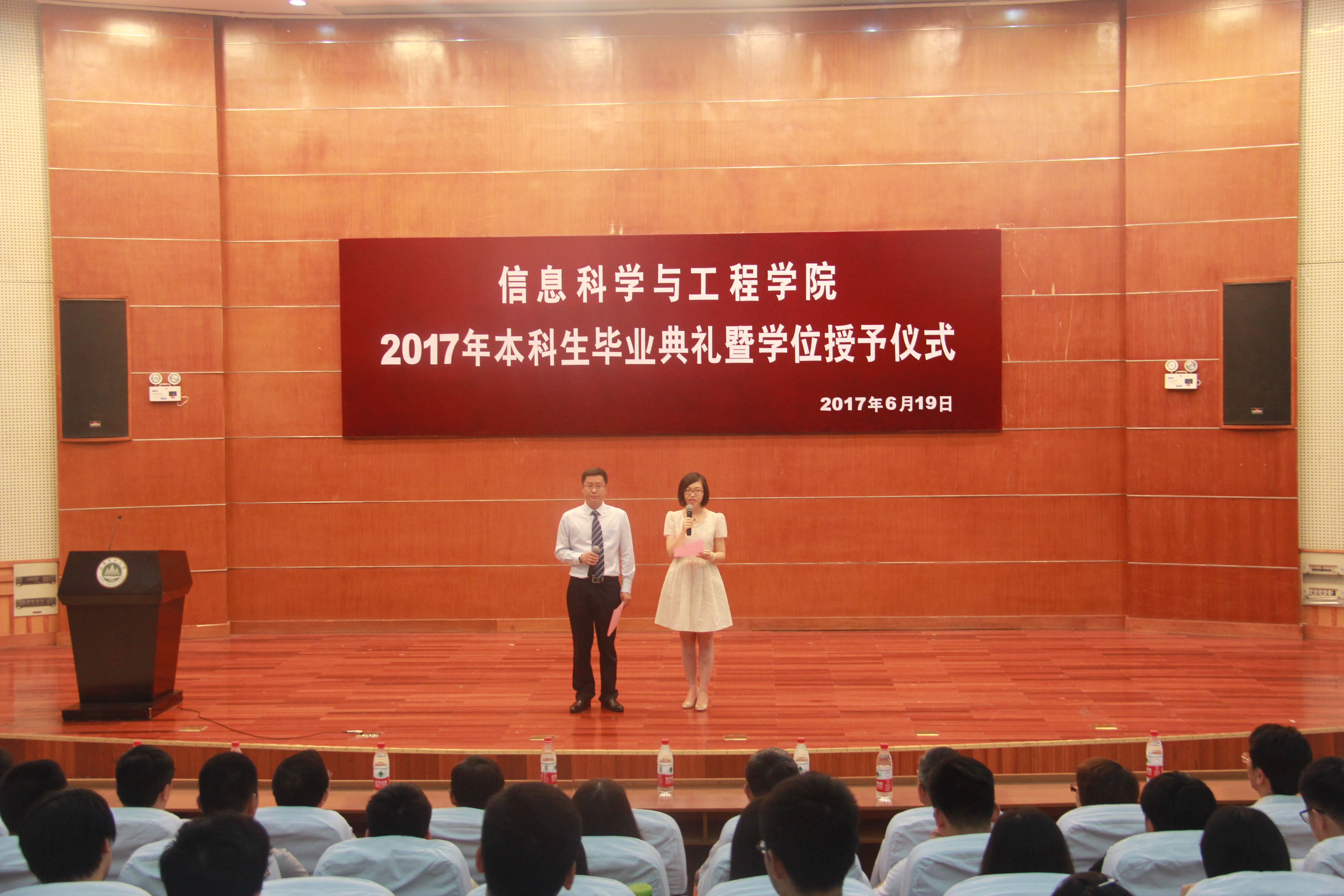 6月19日,信息学院2017届毕业典礼暨学位授予仪式在文理大楼学术报告厅举行,学院领导、教授委员会主任、各系主任、专业主任、教师代表、全体院办团委老师及2017届毕业生出席此次会议。