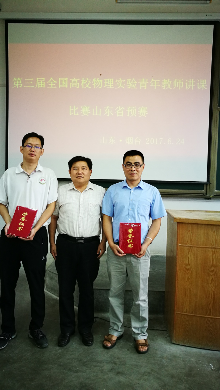 近日,信息学院教师在第三届全国高等学校物理基础课程(山东赛区)比赛中获佳绩,信息学院物理系主任曹学成教授带领吕刚、高峰两位老师参加比赛。经过激烈的预赛和决赛,吕刚老师荣获一等奖,高峰老师荣获三等奖。