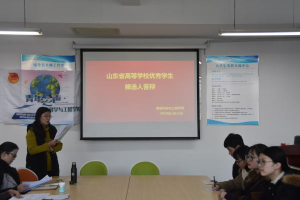 1月12日下午,信息学院于文理大楼404教室进行山东省高等学校优秀学生候选人答辩会。会议由学生发展督导组全体老师及团委辅导员老师出席,14位优秀学生候选人参加。
