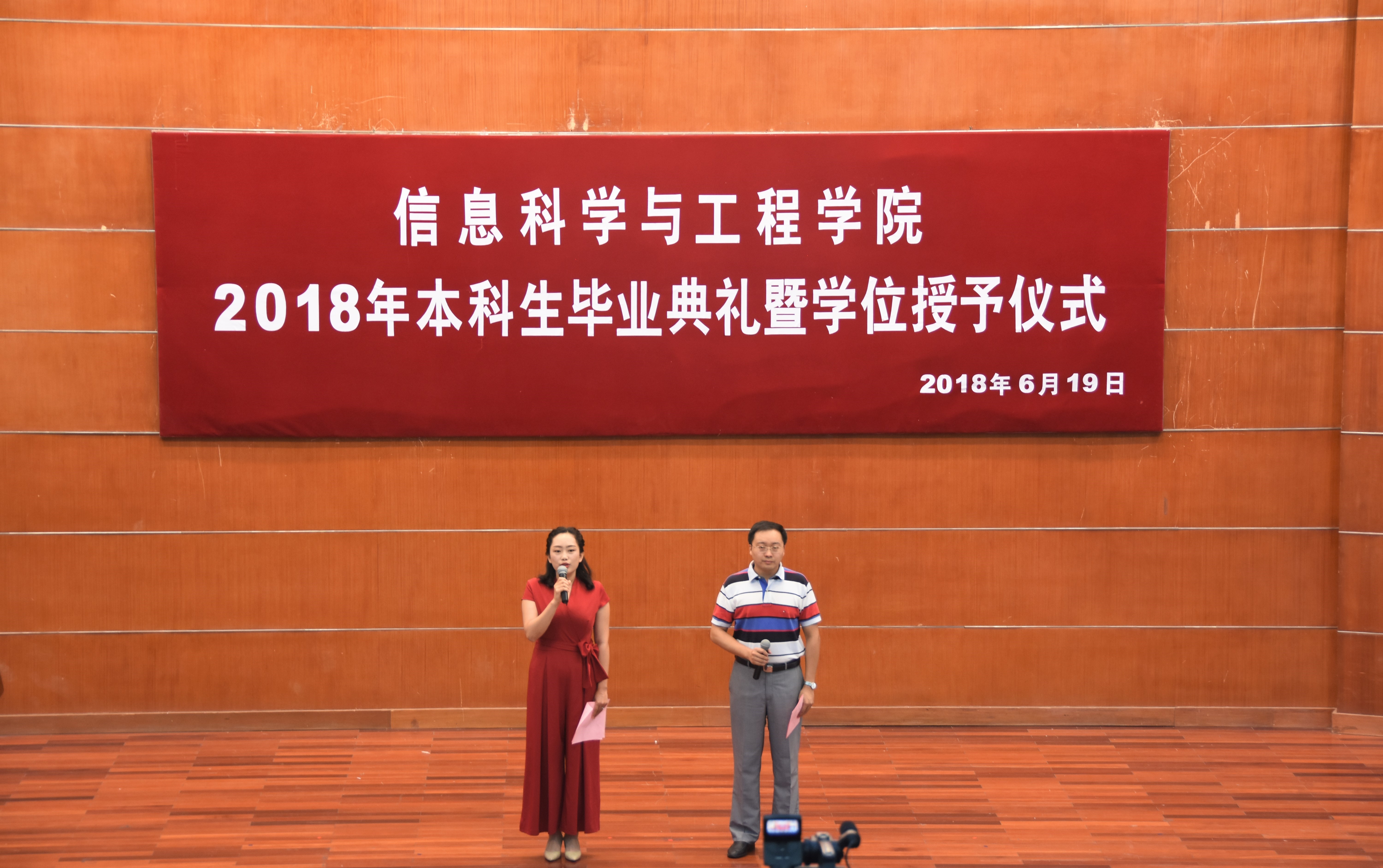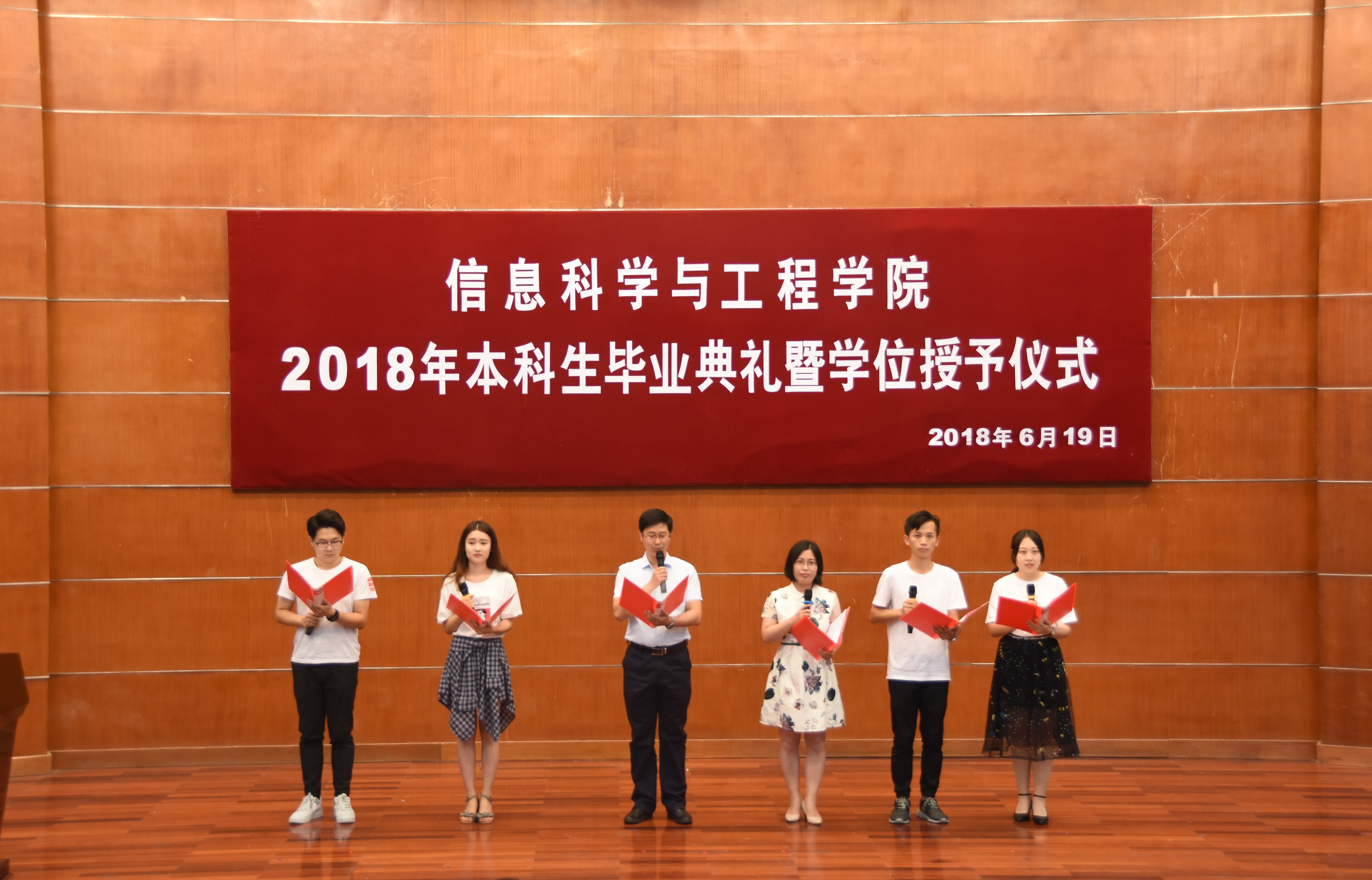 6月19日下午,信息学院2018年本科生毕业典礼暨学位授予仪式在北校区文理大楼学术报告厅隆重举行,学院领导、教授委员会主任、各系主任、专业主任、就业指导老师、家长代表、团委老师及2018届全体毕业生参加典礼。