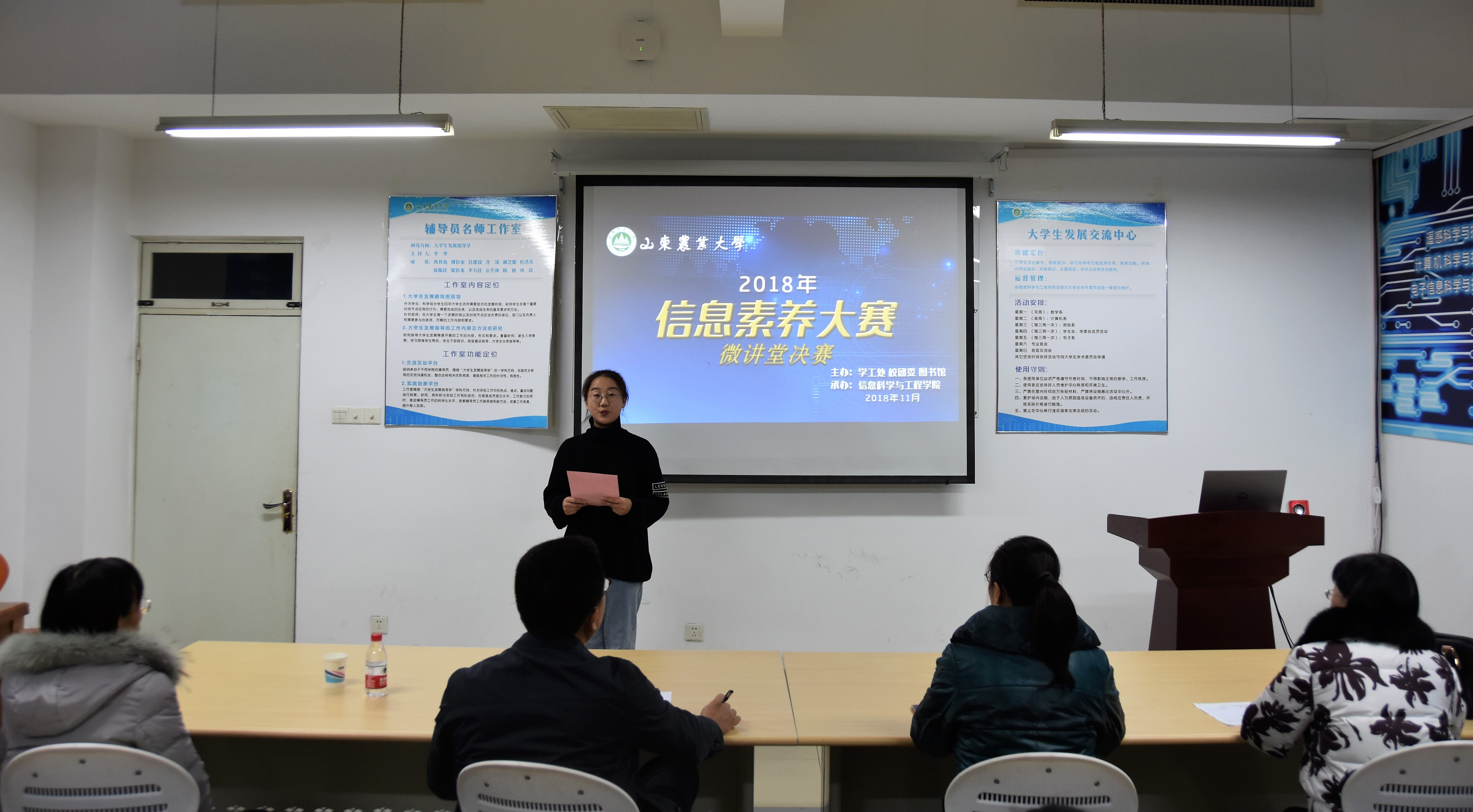 11月21日,信息学院于文理大楼404成功举办信息素养大赛微讲堂决赛。本次比赛由信息学院党委副书记李华老师、图书馆信息咨询部牛鲁玉老师、刘琳老师担任评委,各学院参赛团队参加。
