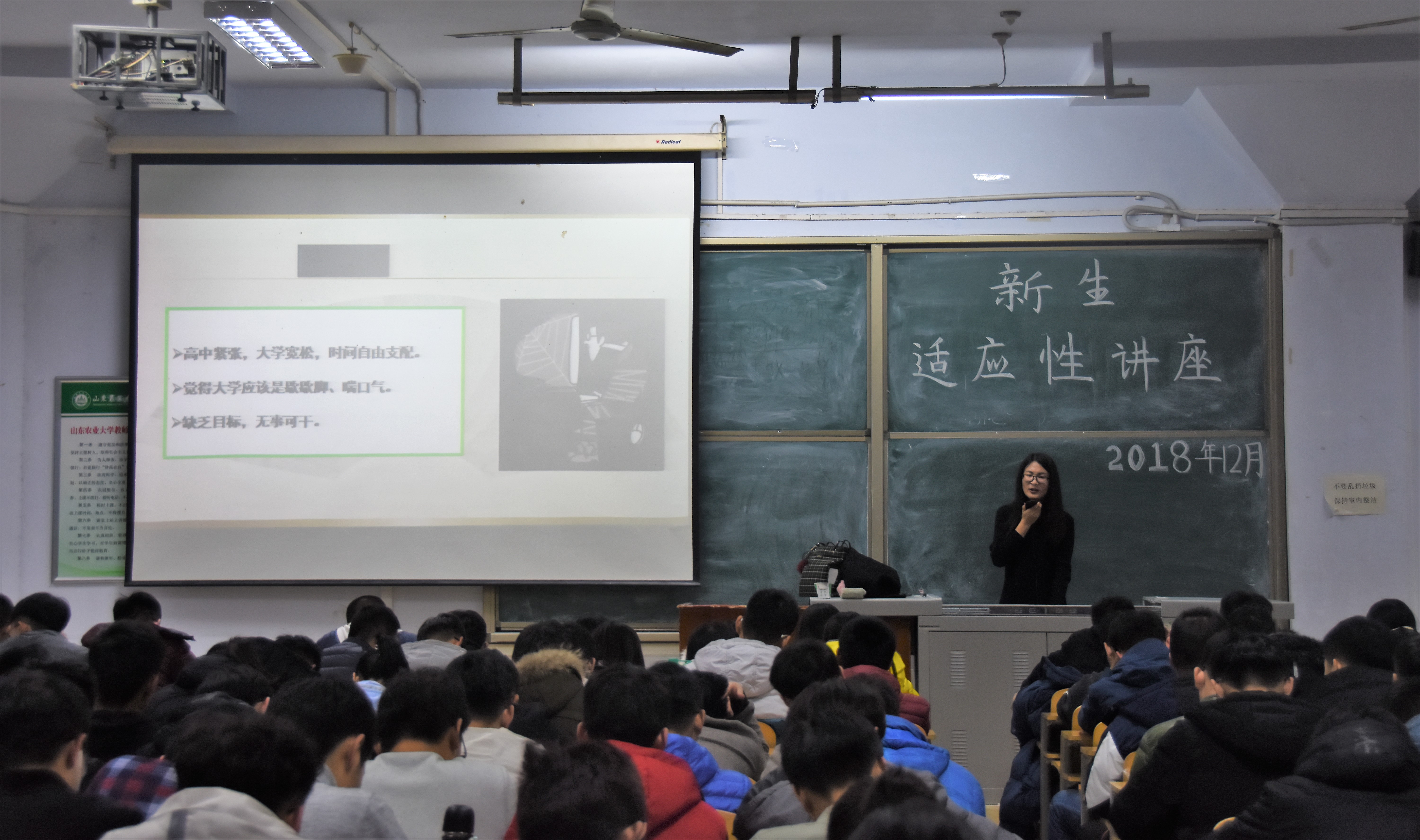 近期,信息学院于东校区成功组织大学新生适应性心理讲座。本次讲座由学工处大学生心理教育中心尹红霞、贺荣珍老师主讲,18级全体同学参加。