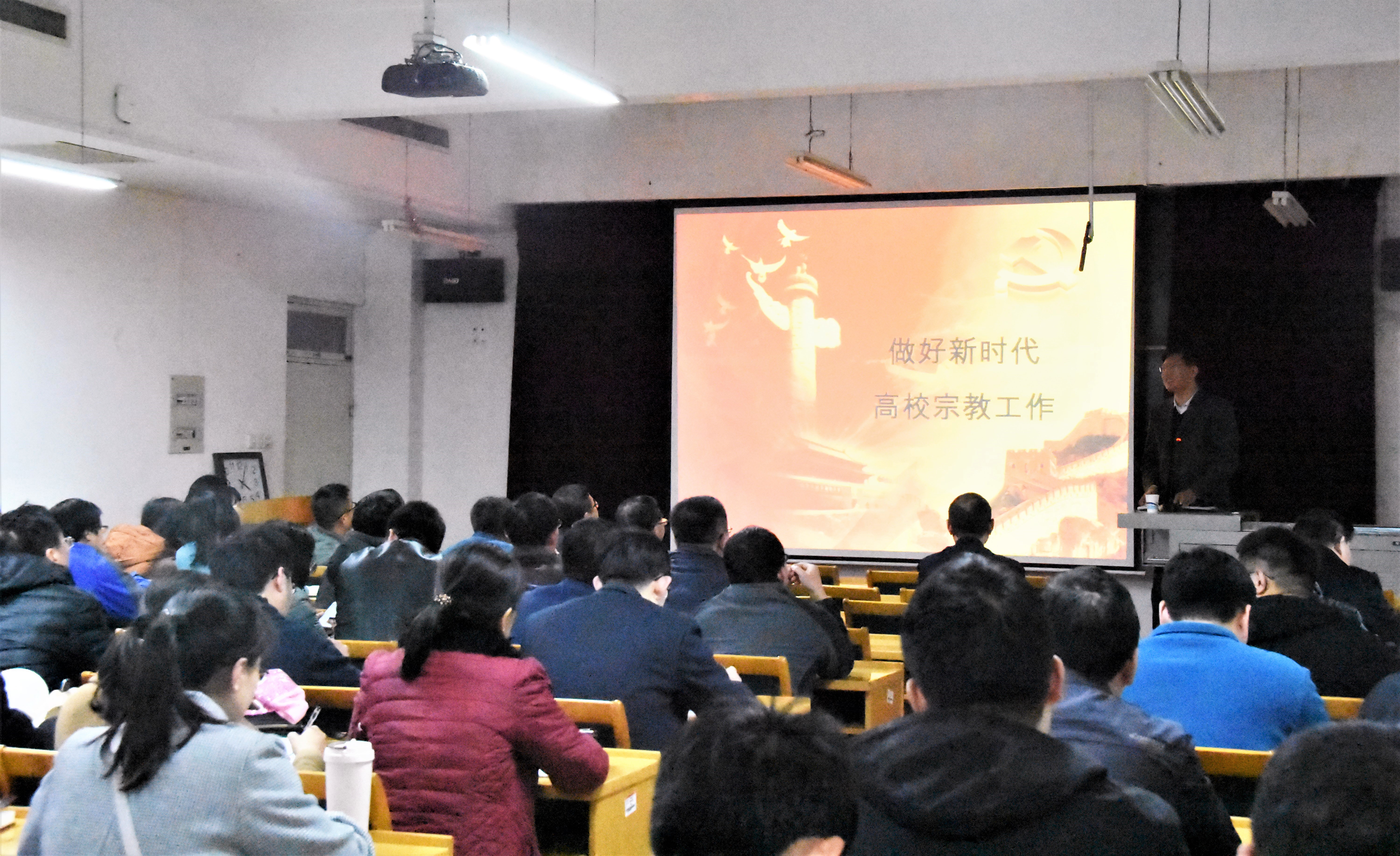 会上,史文宪围绕“如何做好新时代高校宗教工作”这一主题,从我国五大宗教基本情况、党的宗教工作、习近平总书记关于宗教工作的重要论述等五个方面,结合学校学院实际,讲解了新时代高校宗教工作的具体要求。