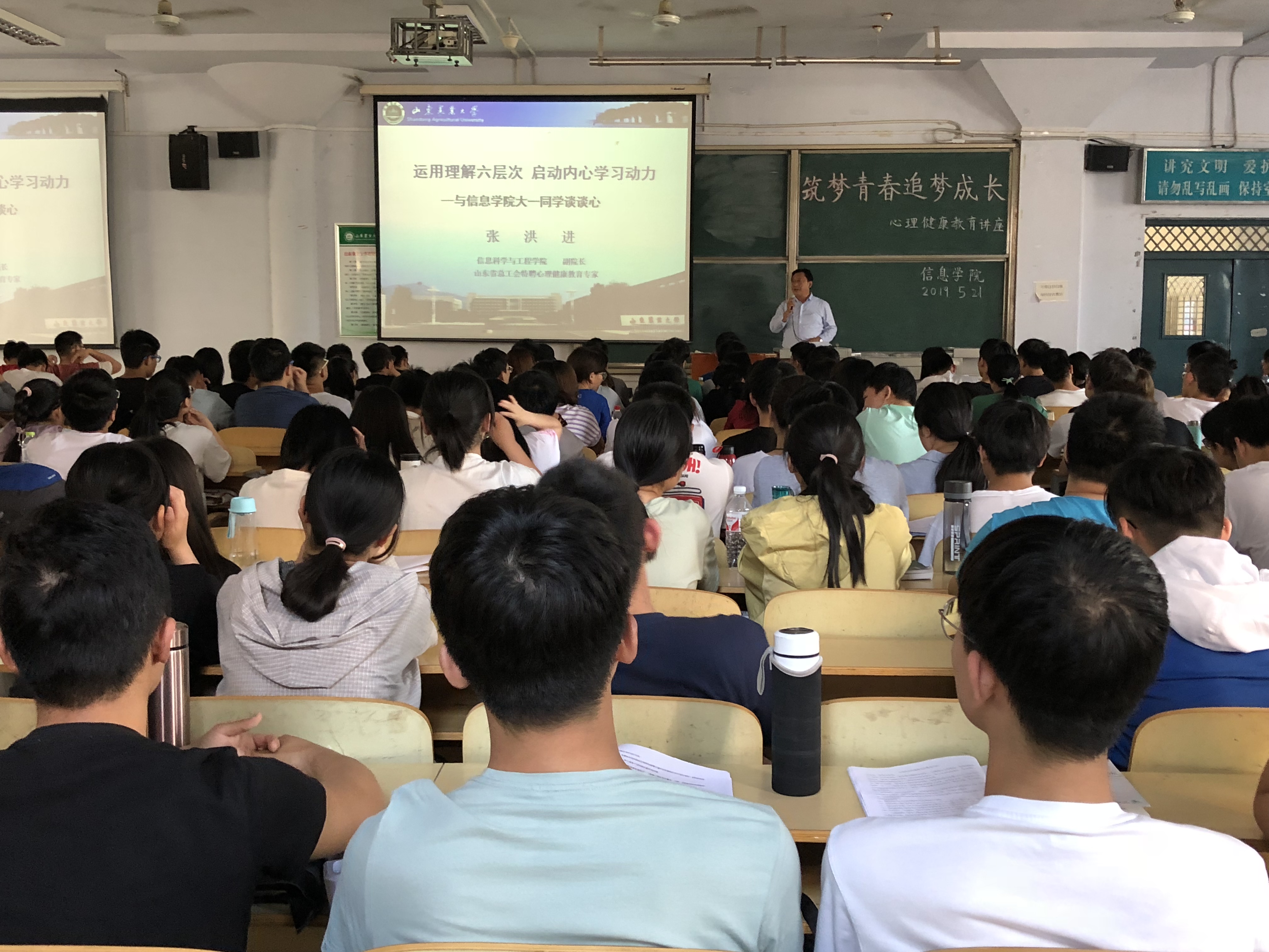 5月21日下午,信息学院于东校区图书楼201举办“筑梦青春,追梦成长”心理健康教育讲座,本次讲座由学院副院长张洪进老师主讲、团委老师及18级全体学生干部参加