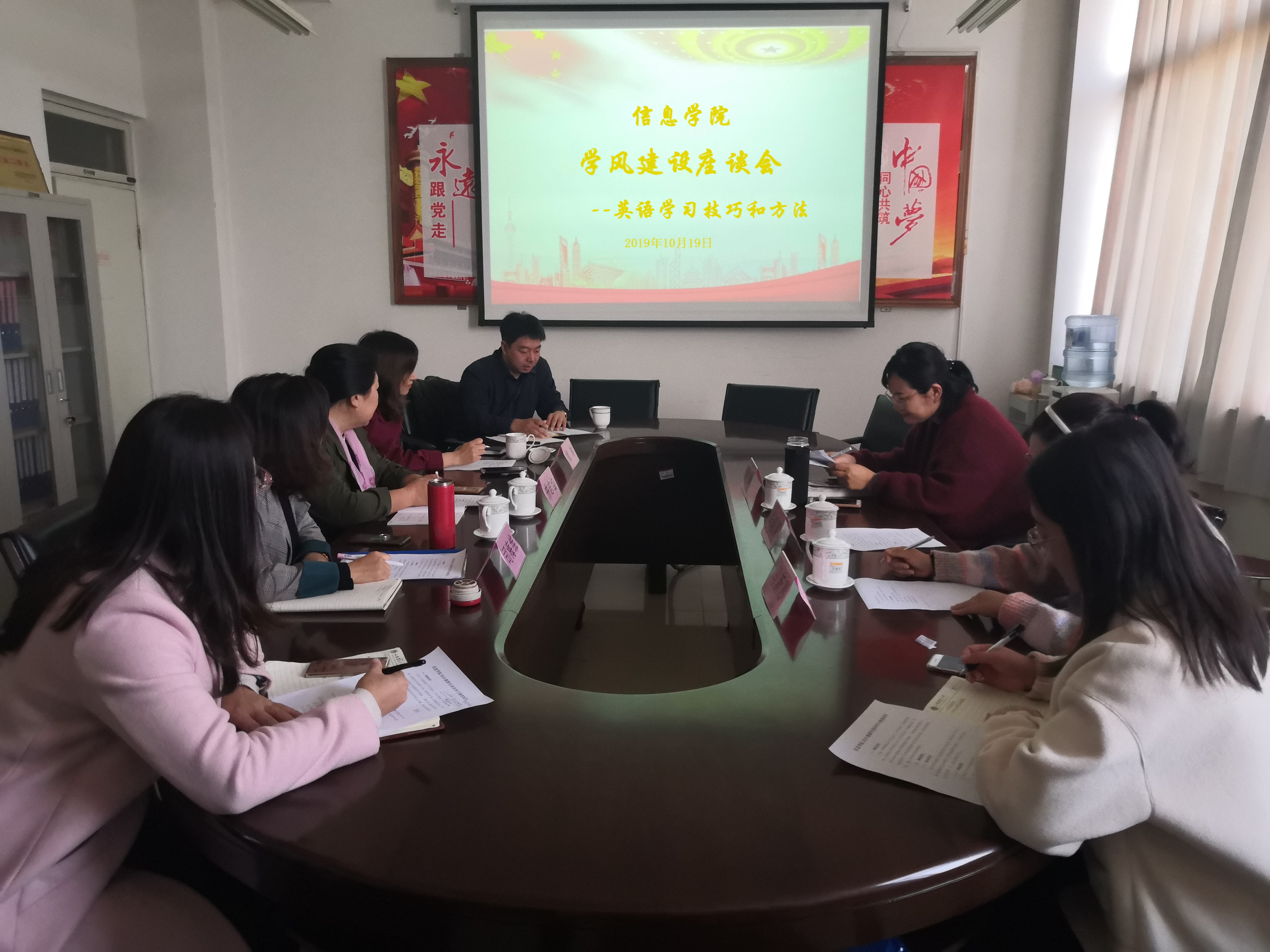 10月18日上午,信息学院于北校区文理大楼1202会议室召开学风建设座谈会,特邀担任2019级新生的7位英语老师参加,会议由学院党委副书记徐宏志主持。