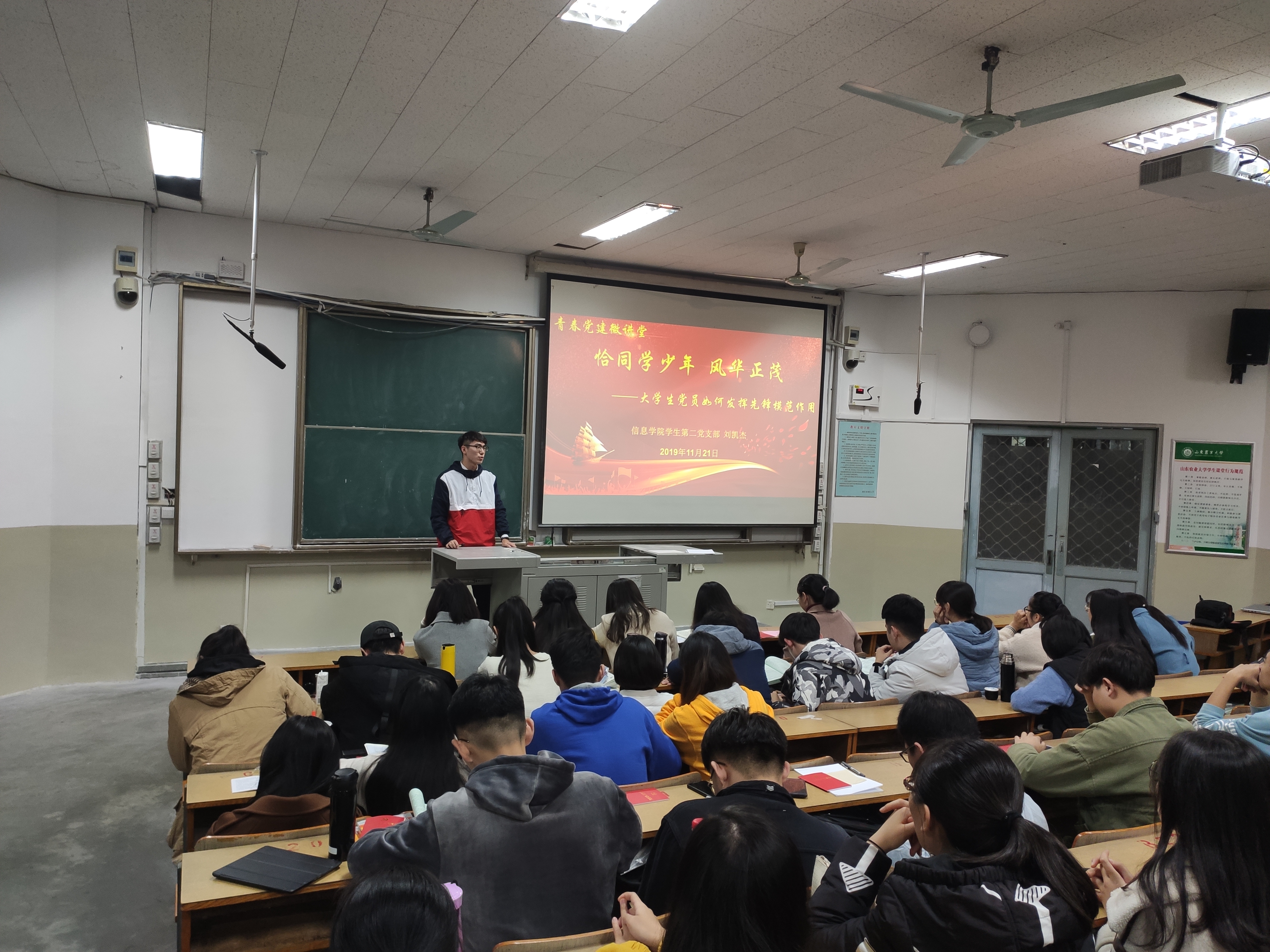 11月21日晚,信息学院于北校区教学楼5N301举办“青春党建微讲堂”主题党日活动。学生支部全体党员及预备党员参加。会前,全体新发展党员进行入党宣誓、老党员重温入党誓词。